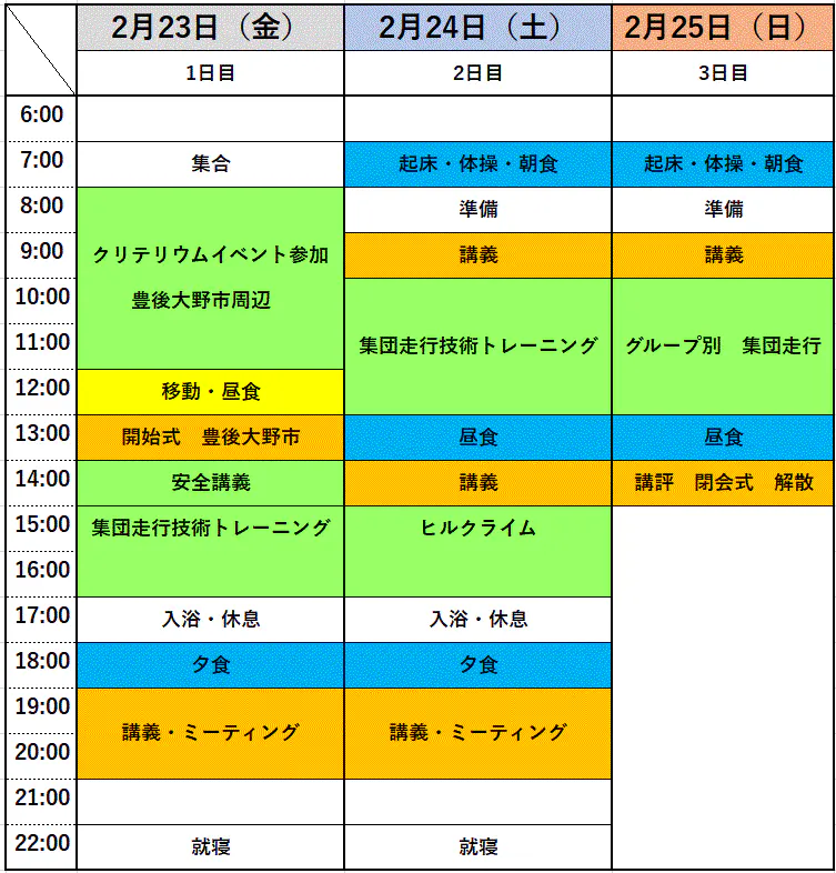 ロードトレーニング実技、ヒルクライム実技、集団走行技術実技、ローテーション技術実技、タイムトライアル走行実技等