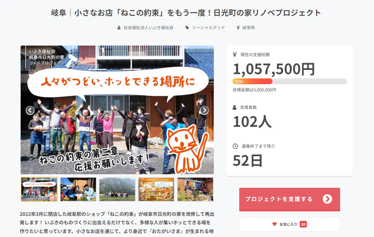 2月14日現在で102名の方から1,057,500円のご支援をいただいております。