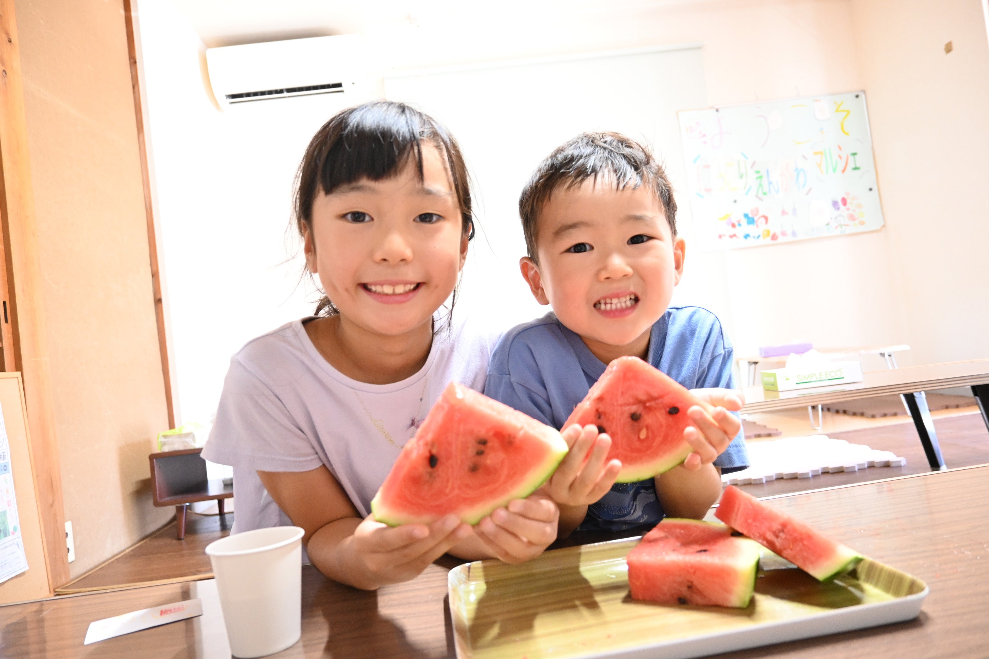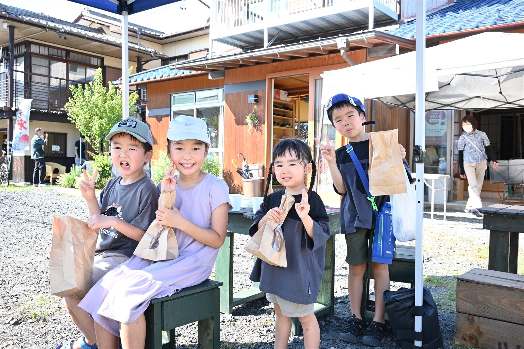 にっこりえんがわマルシェ 2023年11月の様子里芋堀り体験ではスコップを使って「よいしょ!」大きな親芋にくっついたたくさんの子芋に目をまん丸。はじめてみたそうです☆大好評のお芋クイズ♪「サツマイモだけを食べた時のおならはくさい?」出題とともにみんなニヤニヤ(#^^#)「人によるでしょ~」「理想は、、、!」正解は「くさくない!」お母さんの「あなたの明日からのご飯は1週間サツマイモね!」というコメントに思わず「え~~!!」きっと日頃からと思い大爆笑させていただきました!笑 たっぷり頭を使った後はおまちかね秋の味覚の焼き芋とサツマイモご飯です。自然栽培のお米とサツマイモで作ったご飯は相性ばっちり!自分たちで順番を相談してご飯をお椀によそっていたね♪心も身体もあたたまったぞ~(#^^#)