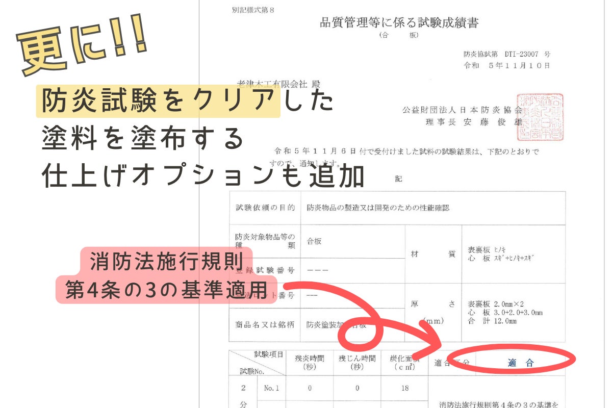 実際に同じ塗料を塗布したサンプルを防炎試験に通すことで専用塗装会社と連携を図りオプション塗装として追加いたしました。