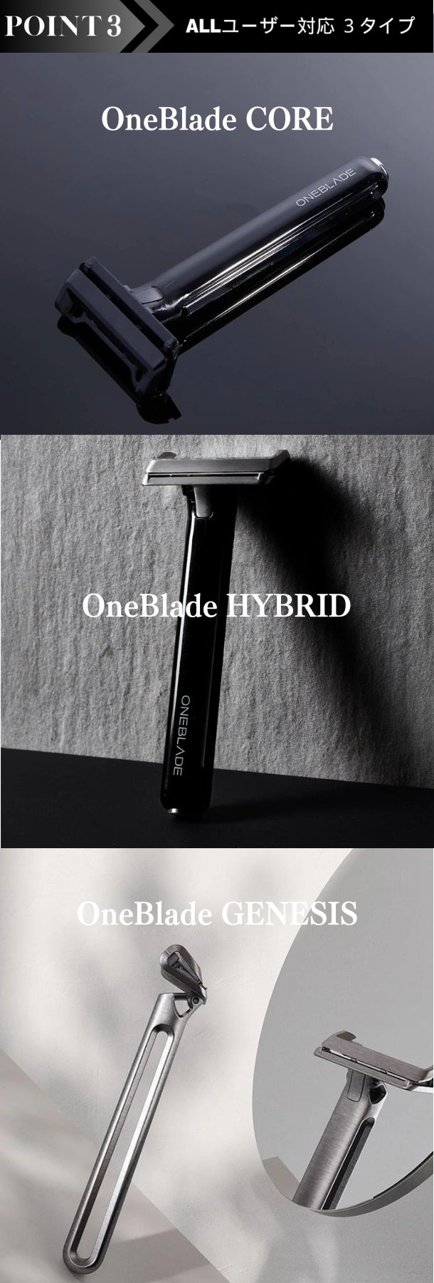 OneBladeは特殊ヘッド構造の為、一番鋭く設定されているGENESISでさえ、初めて使用の方も簡単にお使いいただけます。
