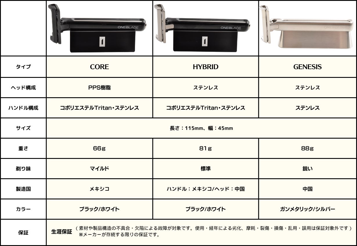 A:OneBlade Razorシリーズ本体には、すべて生涯保証が付きますので安心してご愛用いただけます。