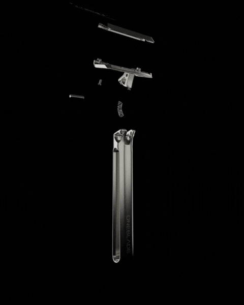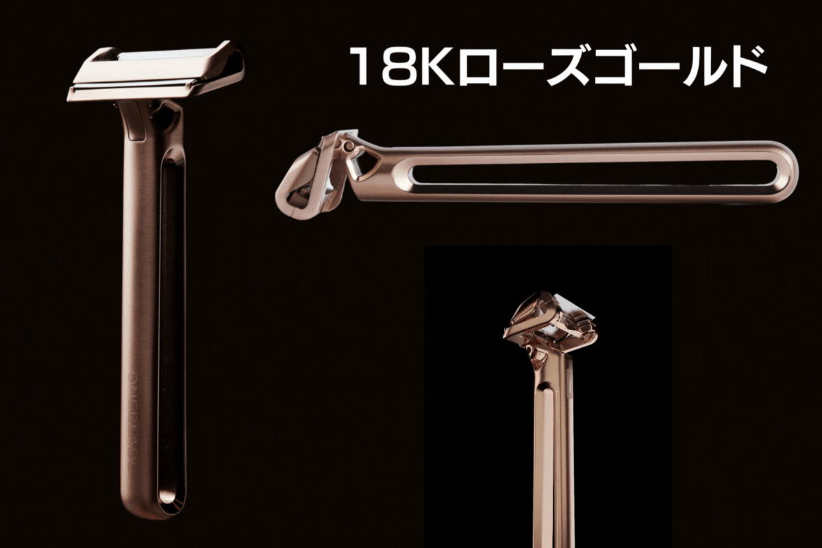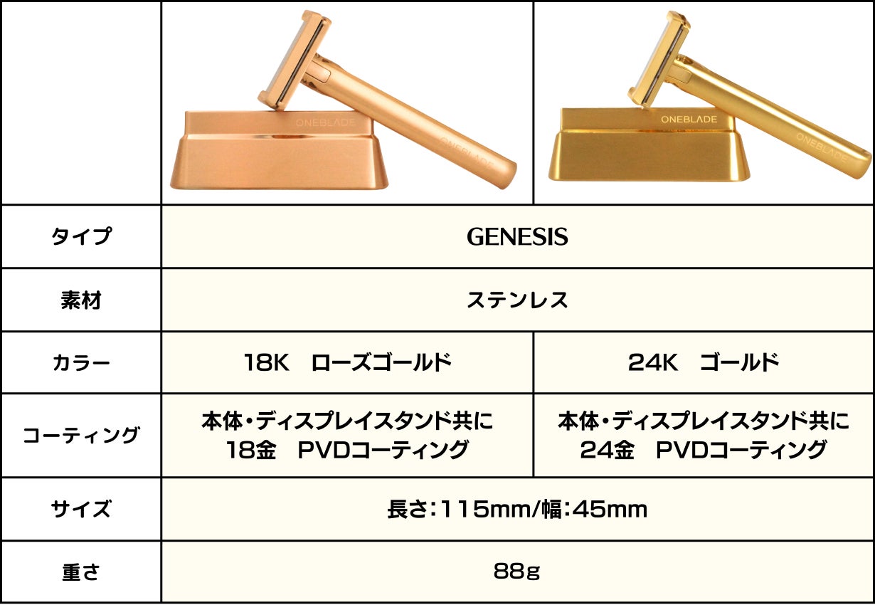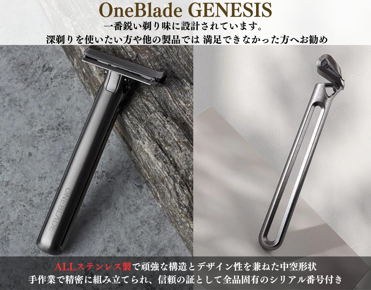 GENESIS:最も鋭い刃の設定を持つオープンコムタイプで、素材はALLステンレスとなり、中空構造の洗練されたデザインが特徴です。付属のスタンドもアルミニウム製から本体と同じPVDコーティングのステンレス素材にバージョンアップし、製品には固有のシリアルナンバーが付いています。