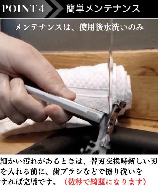A:日々のお手入れは水ですすぎ洗いするだけです。替刃交換時に細かな汚れがあった時だけ歯ブラシなどを使い、流水で軽く擦り洗いをするだけという超簡単メンテナンスです。