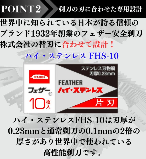 この問題を解決するために、世界中の無数の剃刀の中から最高品質といえる製品を選出するため2年もの歳月をかけ、見つけたのが、日本のフェザー安全剃刀株式会社製“ハイ・ステンレス FHS−10”です。