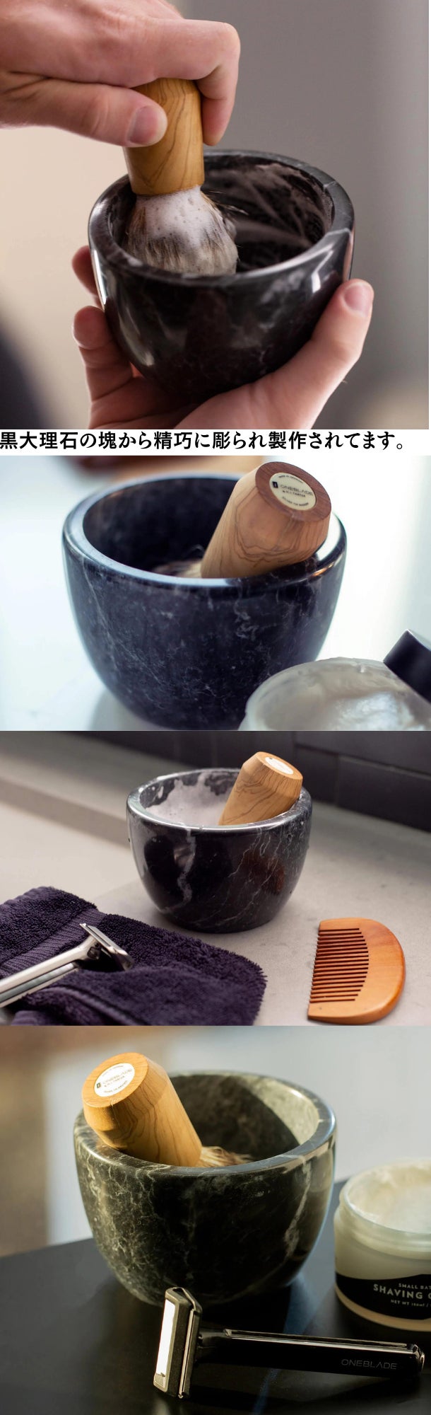 “鮮やかな白い模様が特徴的な黒大理石素材で作られたOneBladeのシェーブボウルが、貴方のシェービング体験を一段と引き立てます。”