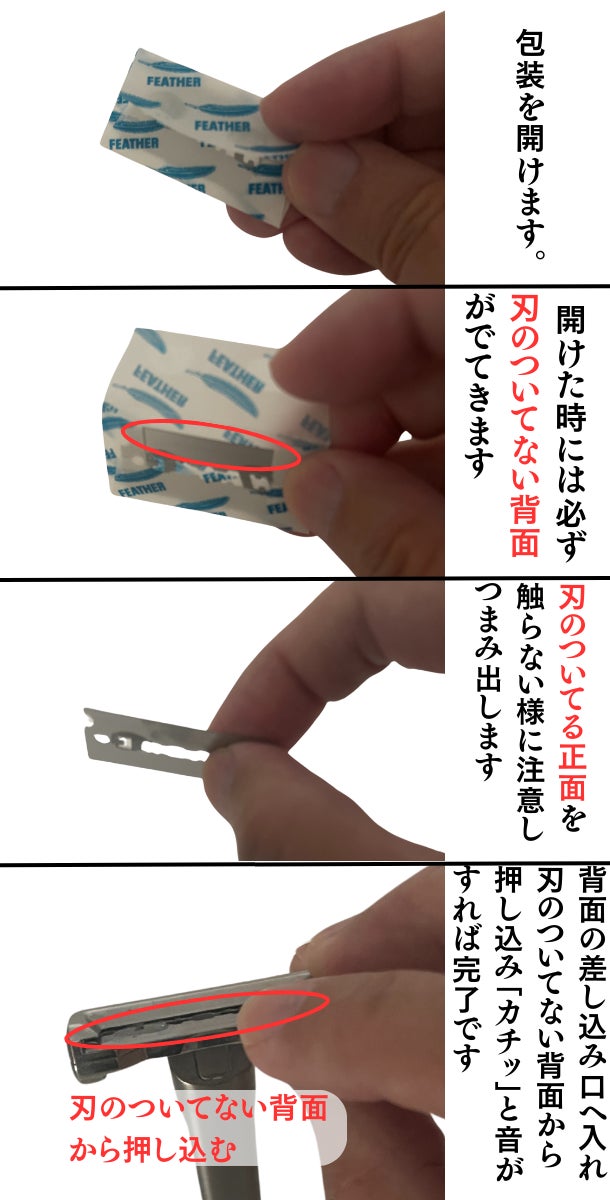 ご支援いただきました皆様、今回は、シングル式(片刃)シェーバーの「替刃装填」について、初めてご使用になる方々を対象に、補足情報を提供させていただきます。シングル式シェーバーは両刃とは違い、一面にのみ刃が付いている構造です。(刃が付いている面(正面)と付いていない面(背面))フェザーの替刃は、安全性の配慮から「包装を開けた際に最初に見える面」が必ず「刃のない背面」になるように包装されています。この特性を理解した上で、添付画像を参考に刃を慎重に取り出し、シェーバーの背面挿入口に差し込んでください。その後、「刃のない背面」からカチッと音がするまで押し込むと装填完了です。初めてのご使用になる方も、この情報を参考に、安全かつ快適なシェービングをお楽しみください。何卒、よろしくお願い申し上げます。