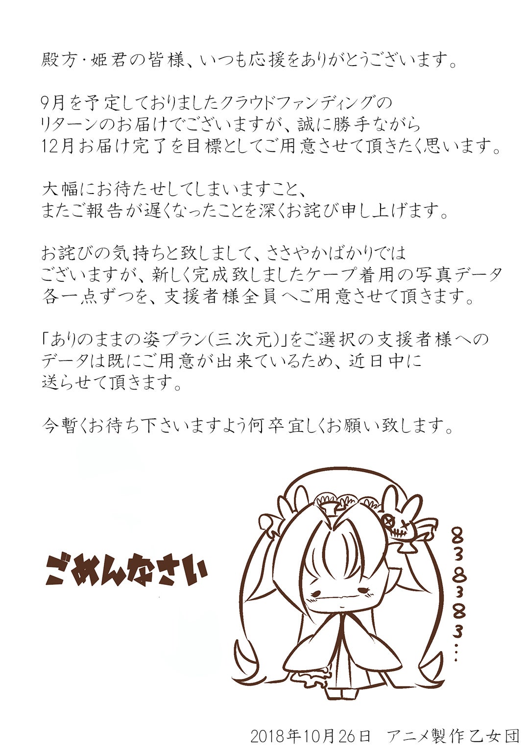 2019/03/31 23:53団員NO.1 遊佐めぐみです。大変お待たせして申し訳ございません。アニメ製作乙女団のメールアドレス(otomedan115@gmail.com)にて、支援者皆様へご連絡を送らせていただきました。お手数をおかけしてしまい申し訳ございませんが、ご確認をお願いいたします!届いていないという方はお手数をおかけしますが(otomedan115@gmail.com )へキャンプファイヤー支援者名・支援プランをご記入のうえ、ご連絡をお願いいたします。遊佐 もっと見る