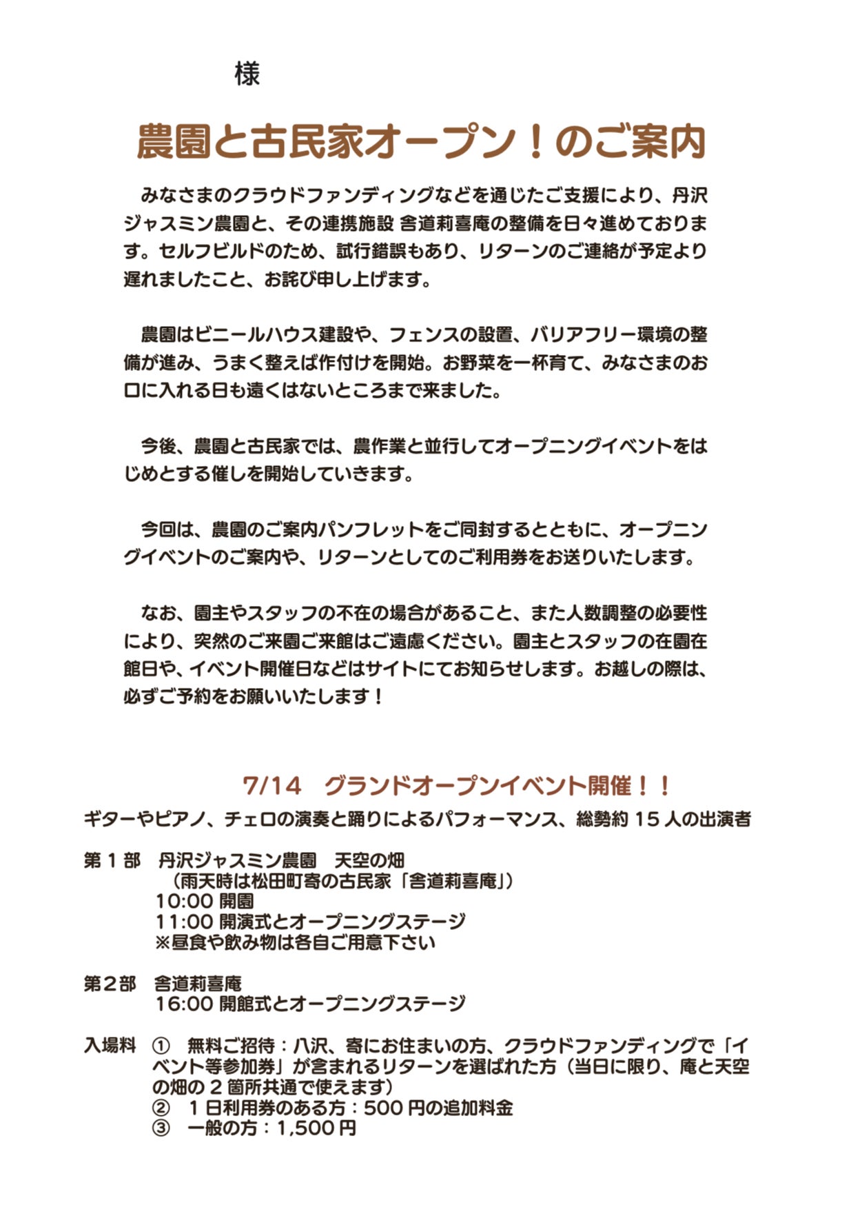 2024/07/06 10:19【クラファン支援者の皆様へ】農園と古民家のリーフレットとともにこちらのお手紙とリターンの発送準備しております各種チケットを該当者に同封させていただきます。7/14には間に合うと思うのですが、、、!間に合わない場合はリストにて対応させていただきますご来園いただける方はご来園方法 または 送迎の希望などをお知らせください^ ^!!当日の駐車場は確保しておりますが台数の把握と送迎スケジュールを立てたいと思いますよろしくお願いいたします^ ^以下、お手紙の内容です農園と古民家オープン!のご案内 みなさまのクラウドファンディングなどを通じたご支援により、丹沢ジャスミン農園と、その連携施設 舎道莉喜庵の整備を日々進めております。セルフビルドのため、試行錯誤もあり、リターンのご連絡が予定より遅れましたこと、お詫び申し上げます。 農園はビニールハウス建設や、フェンスの設置、バリアフリー環境の整備が進み、うまく整えば作付けを開始。お野菜を一杯育て、みなさまのお口に入れる日も遠くはないところまで来ました。 今後、農園と古民家では、農作業と並行してオープニングイベントをはじめとする催しを開始していきます。 今回は、農園のご案内パンフレットをご同封するとともに、オープニングイベントのご案内や、リターンとしてのご利用券をお送りいたします。 なお、園主やスタッフの不在の場合があること、また人数調整の必要性により、突然のご来園ご来館はご遠慮ください。園主とスタッフの在園在館日や、イベント開催日などはサイトにてお知らせします。お越しの際は、必ずご予約をお願いいたします!7/14 グランドオープンイベント開催!!ギターやピアノ、チェロの演奏と踊りによるパフォーマンス、総勢約15人の出演者第1部 丹沢ジャスミン農園 天空の畑 (雨天時は松田町寄の古民家「舎道莉喜庵」) 10:00 開園 11:00 開演式とオープニングステージ ※昼食や飲み物は各自ご用意下さい第2部 舎道莉喜庵 16:00 開館式とオープニングステージ入場料① 無料ご招待:八沢、寄にお住まいの方、クラウドファンディングで「イベント等参加券」が含まれるリターンを選ばれた方(当日に限り、庵と天空の畑の2箇所共通で使えます)② 1日利用券のある方:500円の追加料金③ 一般の方:1,500円アクセスについてご送迎農園、古民家ともに、最寄駅 小田急線「渋沢駅」またはJR御殿場線「松田駅」までご送迎いたします。送迎ご希望の方はご連絡をください。お車で直接お越しの方農園と古民家いずれも駐車スペースがあります(要予約)。なお、お車代、最寄り駅までの交通費はみなさまの方でご負担ください。丹沢ジャスミン農園にお越しの方乗合自動車 農園にお越しの際にご利用いただけます。*舎道莉喜庵へは行けません。「上地区乗合自動車「行け行けぼくらのかみちゃん号」(秦野市)ご利用方法 「渋沢駅北口」で乗車し「上公⺠館駐車場前」「上公民館前」で下車 上公民館からご連絡いただければ、車で3分ほどで迎えに伺いますダイヤ 平日のみ運行 渋沢駅北口→上公民館 発車時間7:10 7:55 9:30 11:40 13:10(その他)上公民館→渋沢駅北口 発車時間7:43 8:28 9:51 12:13 13:31 14:33 16:01 16:58 18:36料金 大人200円〜300円 小児100円 未就学児2人まで無料舎道莉喜庵にお越しの方路線バス(東急モビリティ)1 長寿橋(舎道莉喜庵近くのバス停)新松田駅→長寿橋 平日2本のみ(土日祝運行なし) 発車時間16:05 19:15長寿橋→新松田駅 平日2本のみ(土日祝運行なし) 発車時間7:59 11:392 田代向(舎道莉喜庵から徒歩26分ほどのバス停)新松田駅→田代向 平日13便 土日祝8便田代向→新松田駅 平日13便 土日祝8便乗合バス「のるーと足柄」舎道莉喜庵にお越しの際にご利用いただけます。丹沢ジャスミン農園には行けません。専用アプリ「のるーと足柄」または電話(0120-303-062 受付時間 9:00〜17:00)により、配車リクエストが可能です。1 乗るところ「松田駅周辺146番 JR松田駅」または「新松田駅南側246(180)番 新松田駅南口(東向き)」2 降りるところ「寄地区南側39(40)番 長寿橋(西向き)」料金 大人300円 小人100円 もっと見る