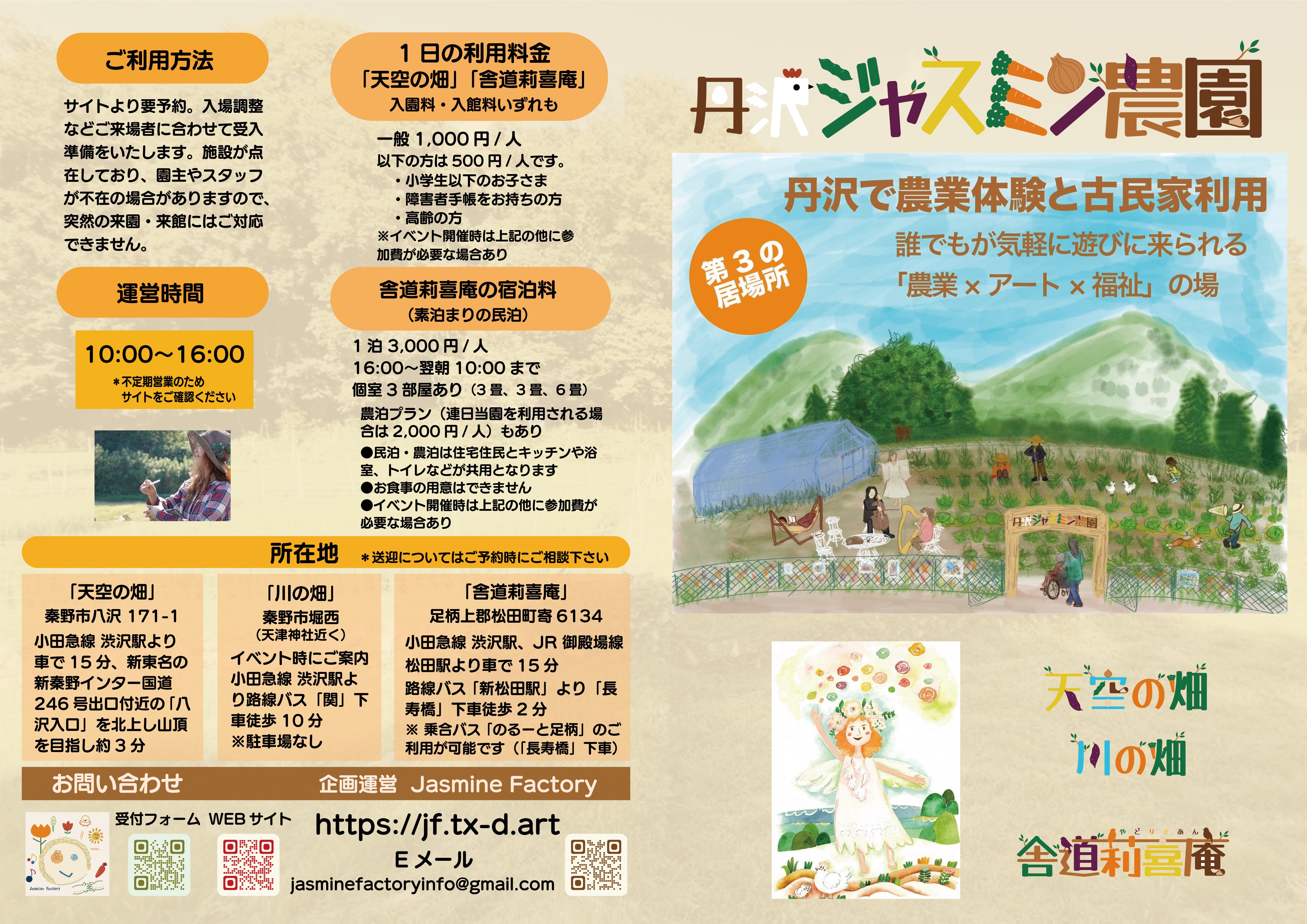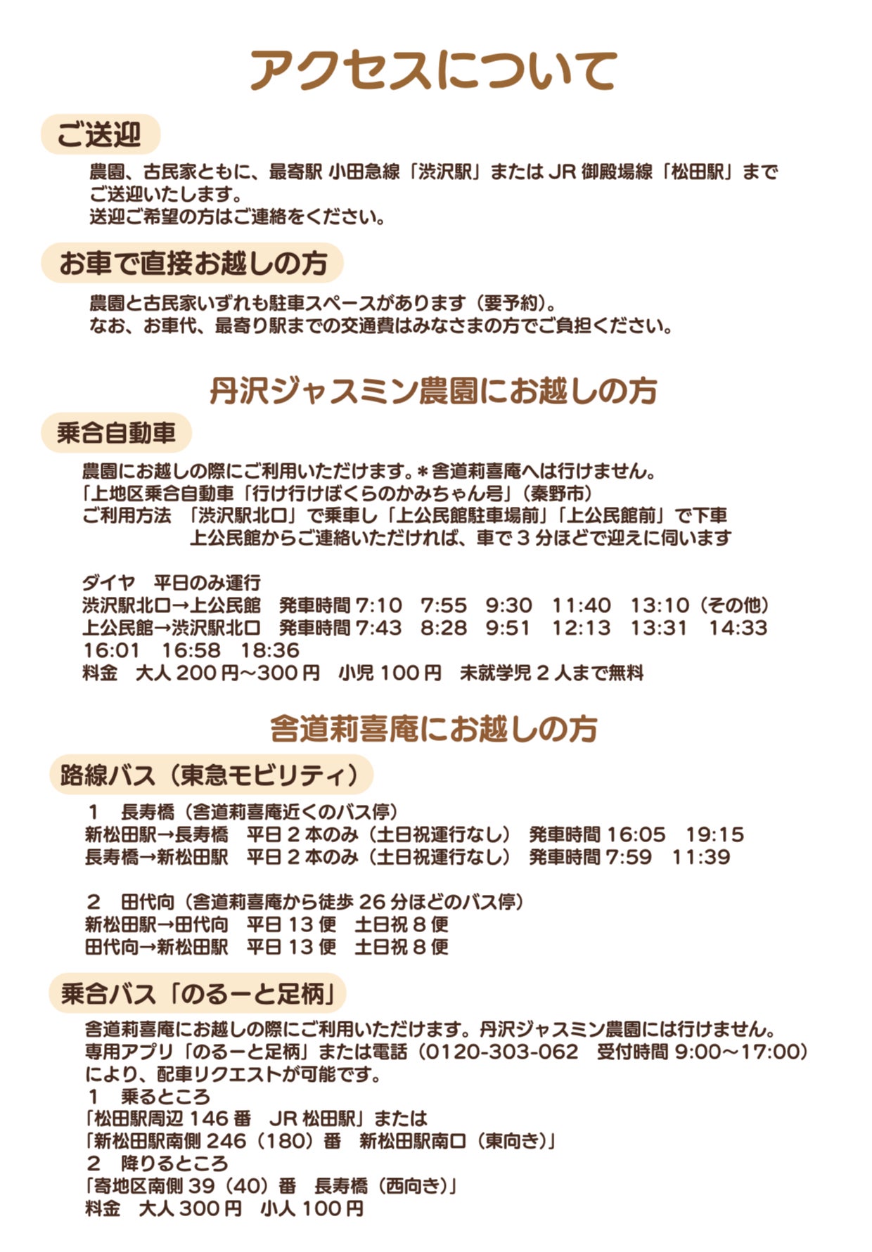 舎道莉喜庵にお越しの際にご利用いただけます。丹沢ジャスミン農園には行けません。