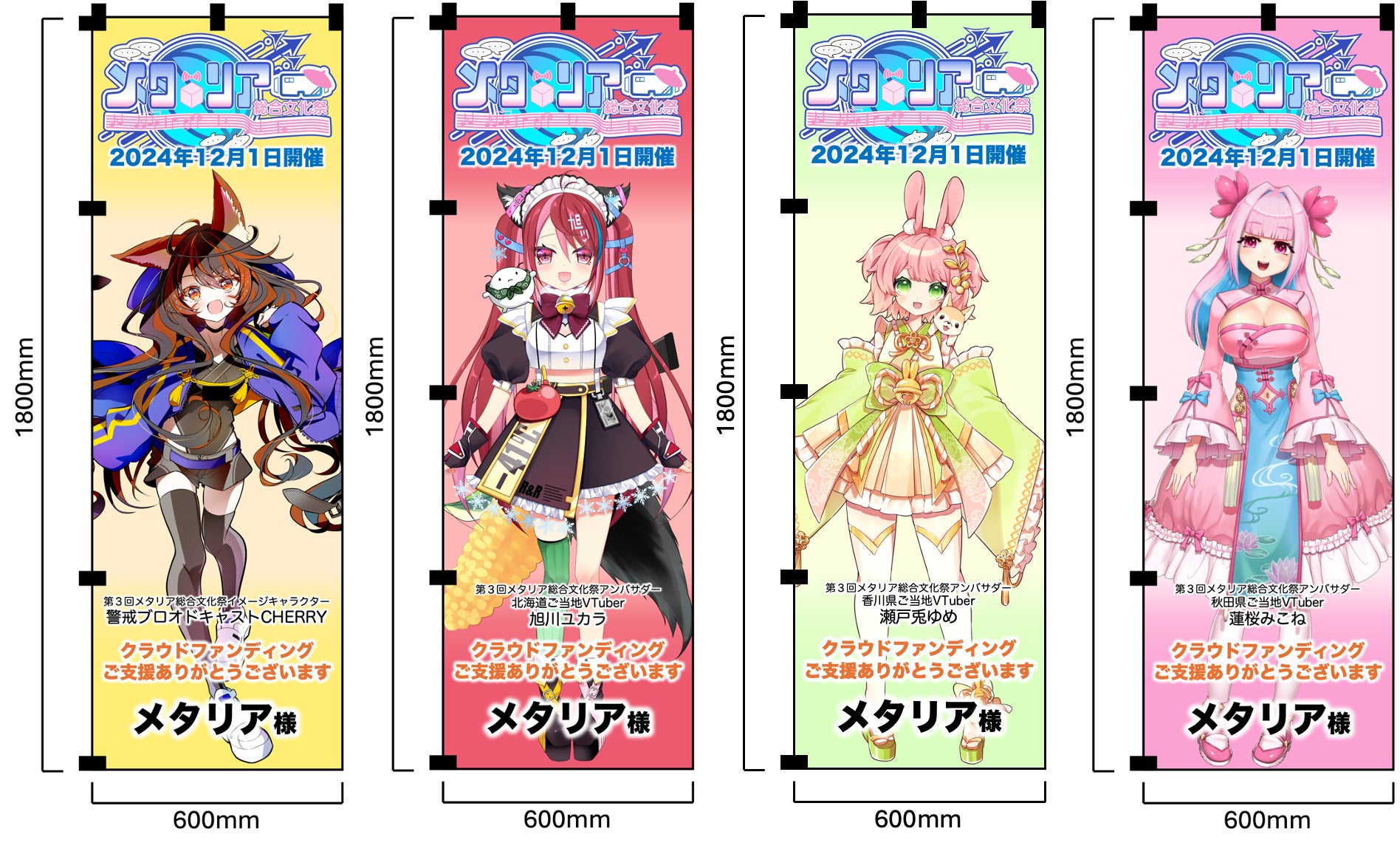 イメージキャラクターやアンバサダーをデザインしたのぼり旗です。イメージ画像の「メタリア様」の部分にご支援者様のお名前やご団体名等が入ります。