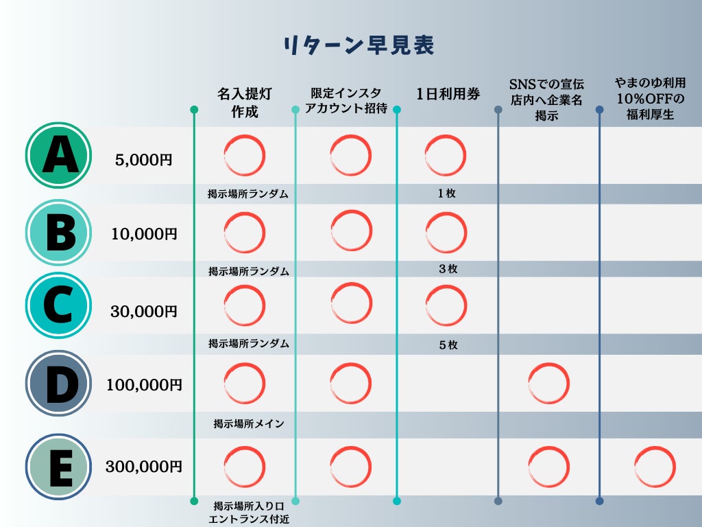 プロジェクトへの支援者には、支援者の名前入り提灯を作成し、施設内に飾り付けさせていただきます。(掲載するのは個人の名前、企業名、メッセージ等ご希望にあわせて作成いたします)そして、やまのゆの1日利用券、プロジェクトメンバーとの交流会や支援者限定のInstagramアカウントへの招待など、さまざまなリターンをご用意しています。支援者の皆様には、やまのゆをさらに知っていただき応援していただけると幸いです。そして支援者の皆様と共に地域に愛される施設を作っていきたいです。