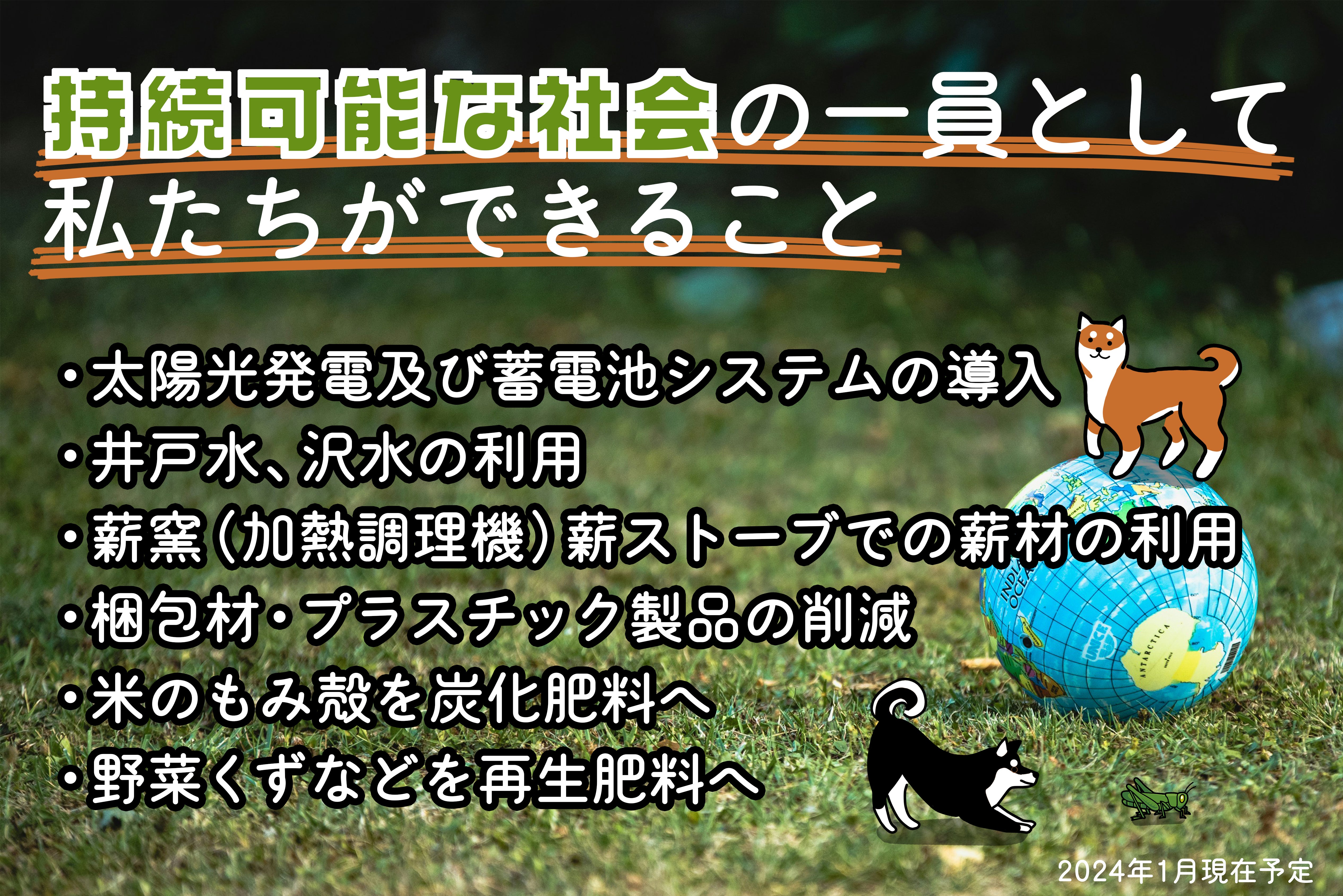 施設計画としては太陽光発電及び蓄電池システムの導入・井戸水、沢水の利用・薪窯(加熱調理機)薪ストーブでの薪材の利用などを予定しています。