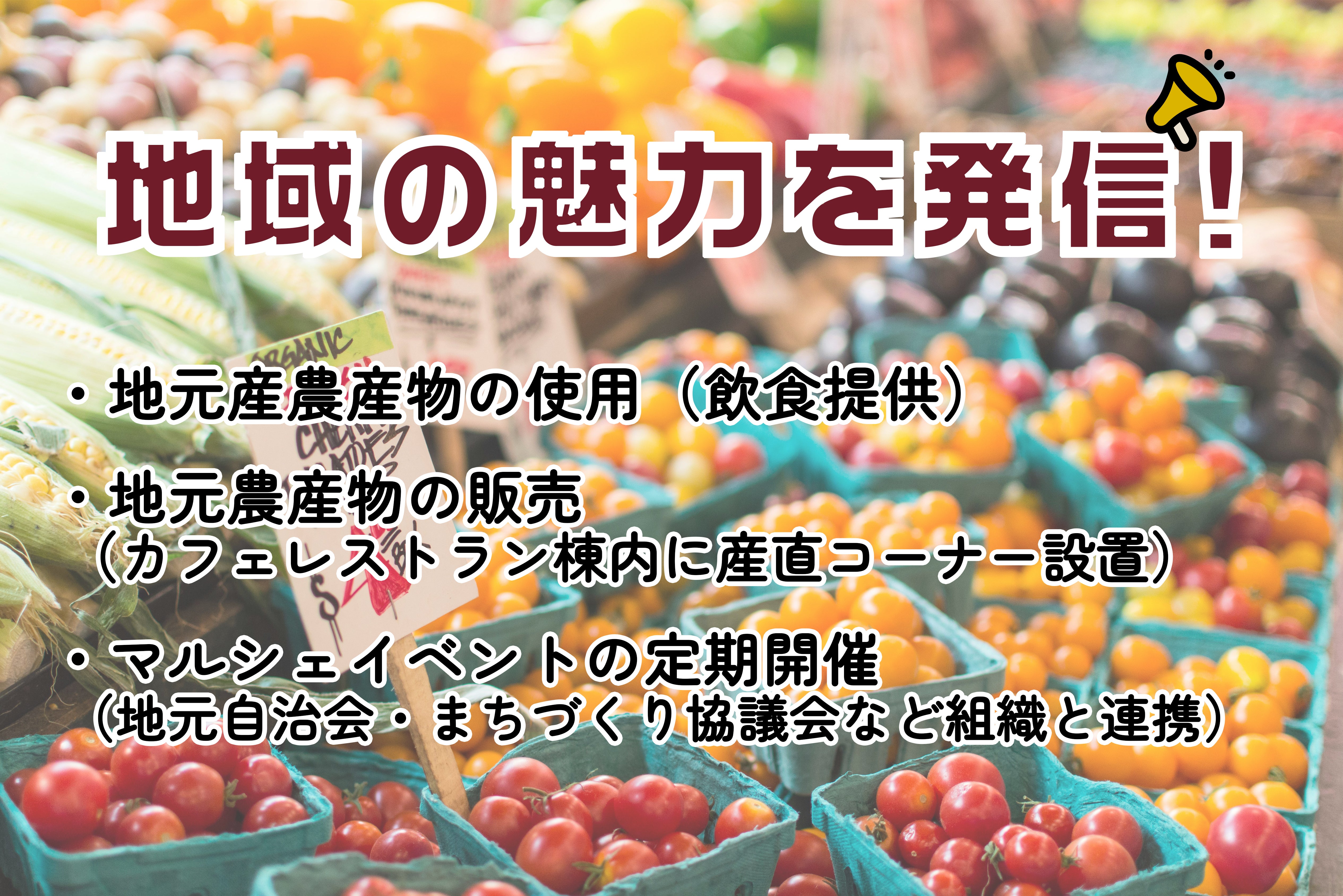 具体的には、地元産農産物の使用(飲食提供)、地元農産物の販売(カフェレストラン棟内に産直コーナー設置)、マルシェイベントの定期開催(地元自治会・まちづくり協議会など組織と連携)を既に決定済です。