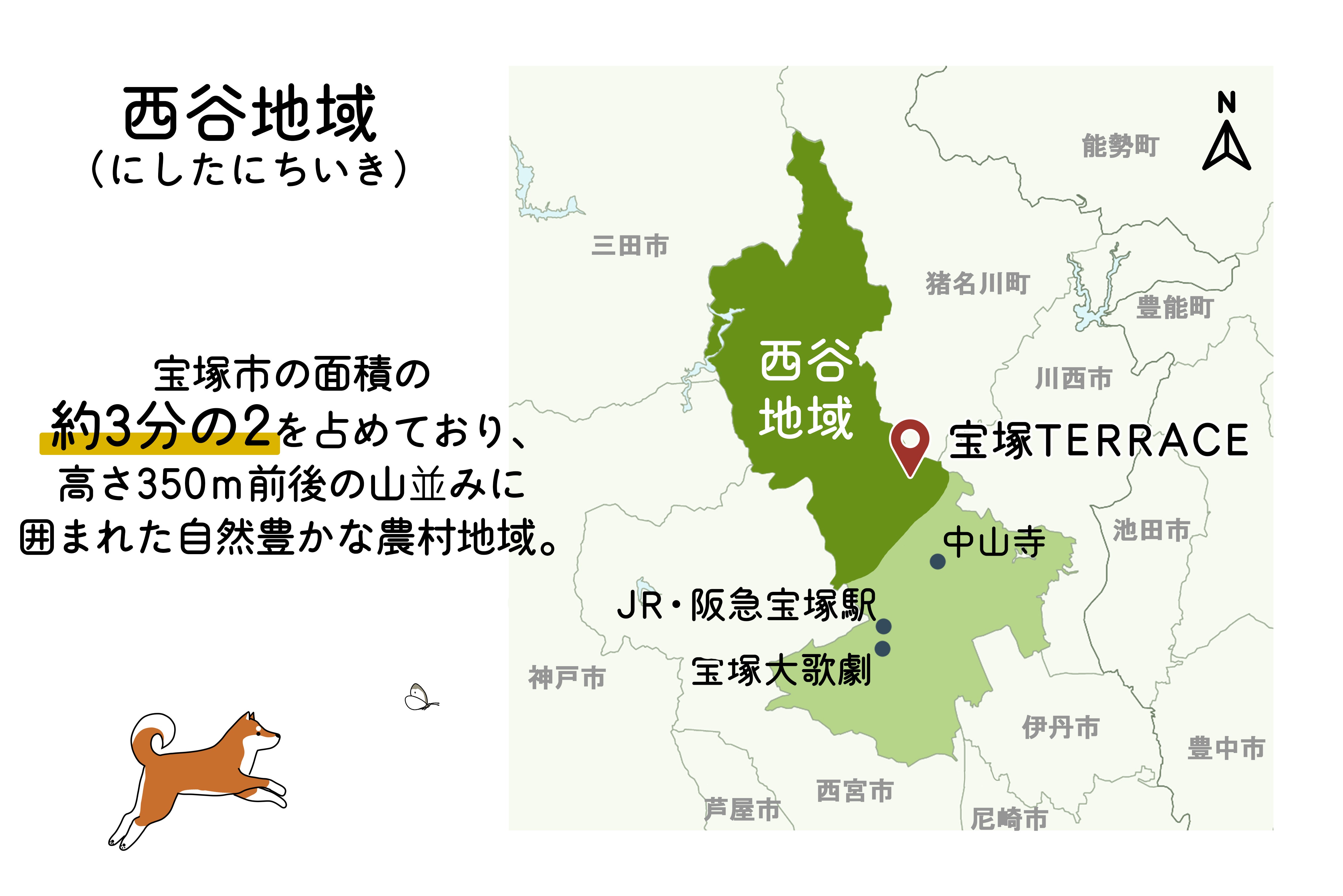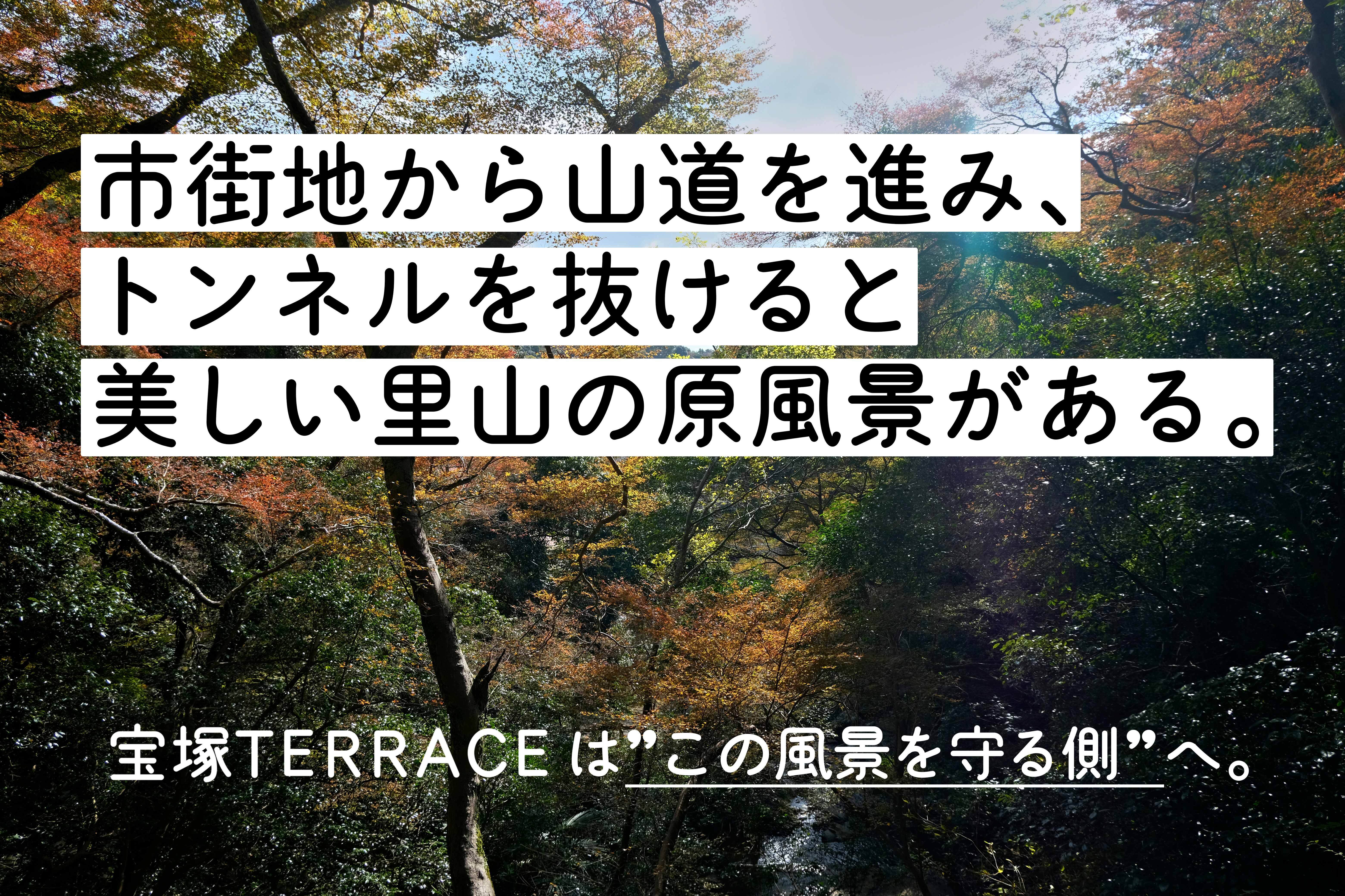 兵庫県宝塚市は古くは宝塚温泉で栄え、宝塚歌劇や手塚治虫、宝塚ファミリーランド(閉園)で全国的に知名度があると思います。しかし歌劇や手塚治虫記念館がある宝塚の市街地は全体の僅か1/3程度。宝塚市の2/3は豊かな山々や自然に囲まれた農村地域「西谷地域」なのです。その西谷地域の最南、”切畑”という集落に宝塚TERRACEはあります。