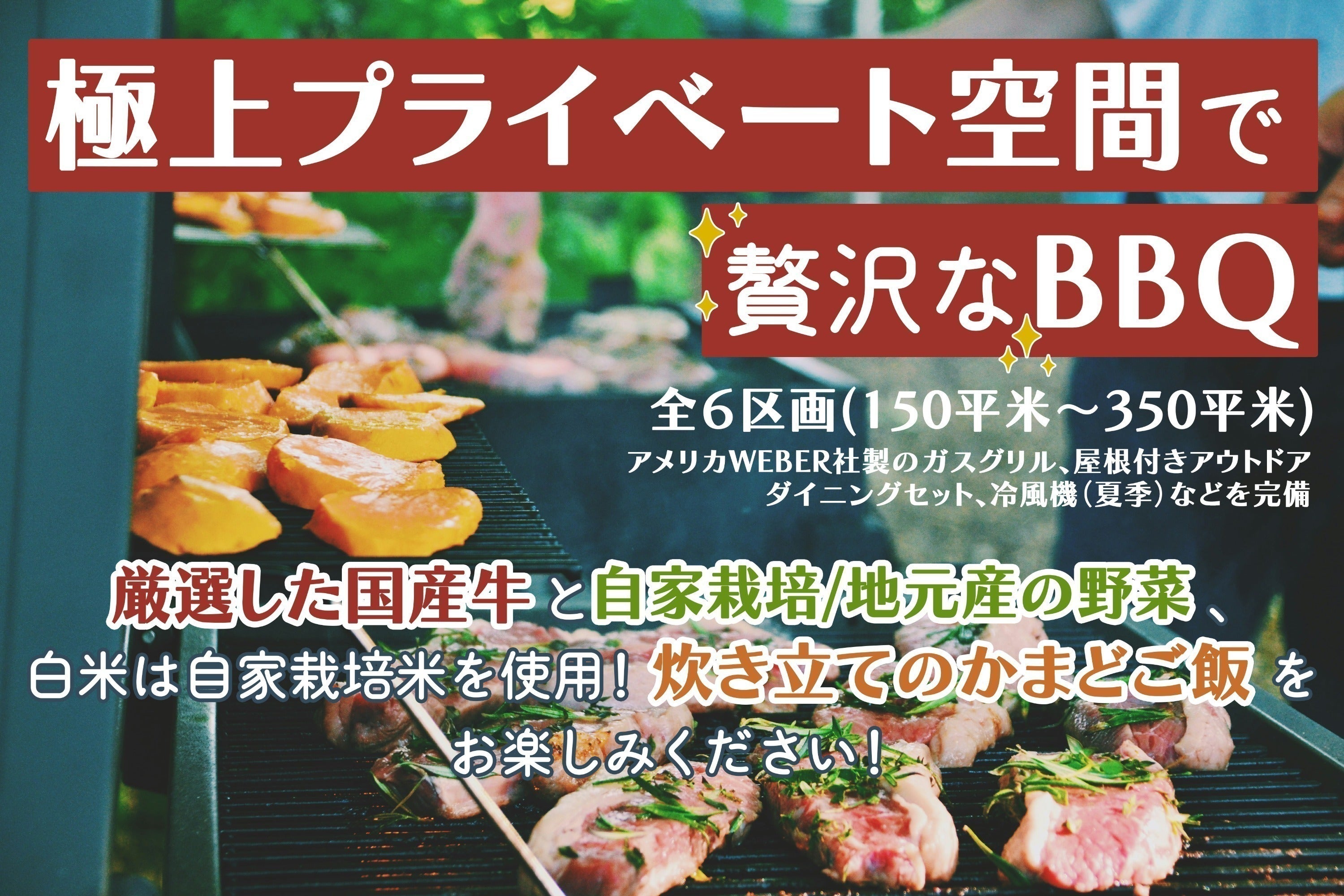 厳選した国産牛と自家栽培および地元産の野菜(収穫体験付きプランあり)を使用。白米は自家栽培米をその場で炊き上げ、炊き立てのかまどご飯をお楽しみいただけます。