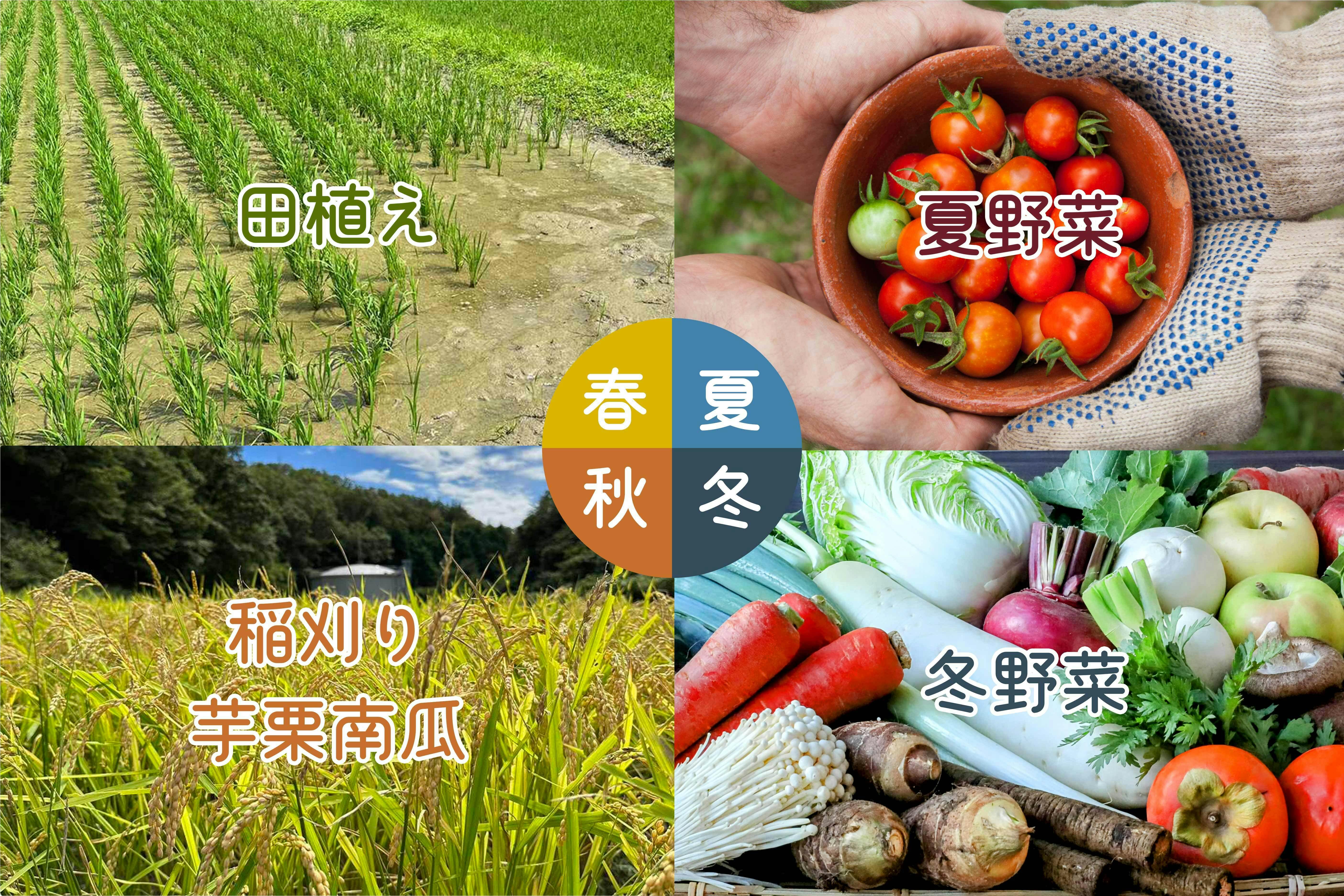 春は田植え。夏は夏野菜色々。秋は稲刈り・芋栗南瓜。冬は冬野菜色々。