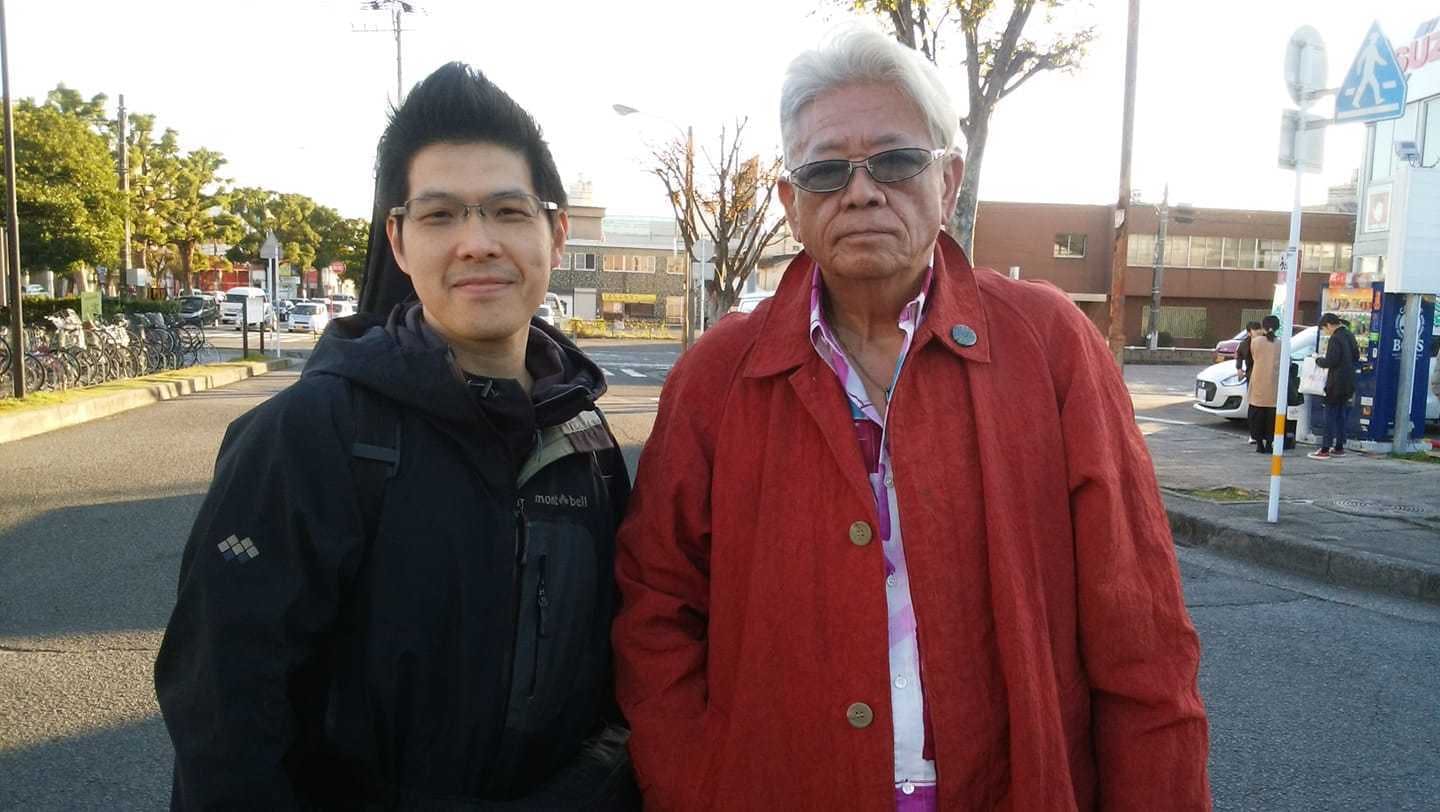 (写真:大分市鶴崎駅前にて。同日別会場公演開催のドラマー、村上ポンタ秀一さんと(2018年11月24日))