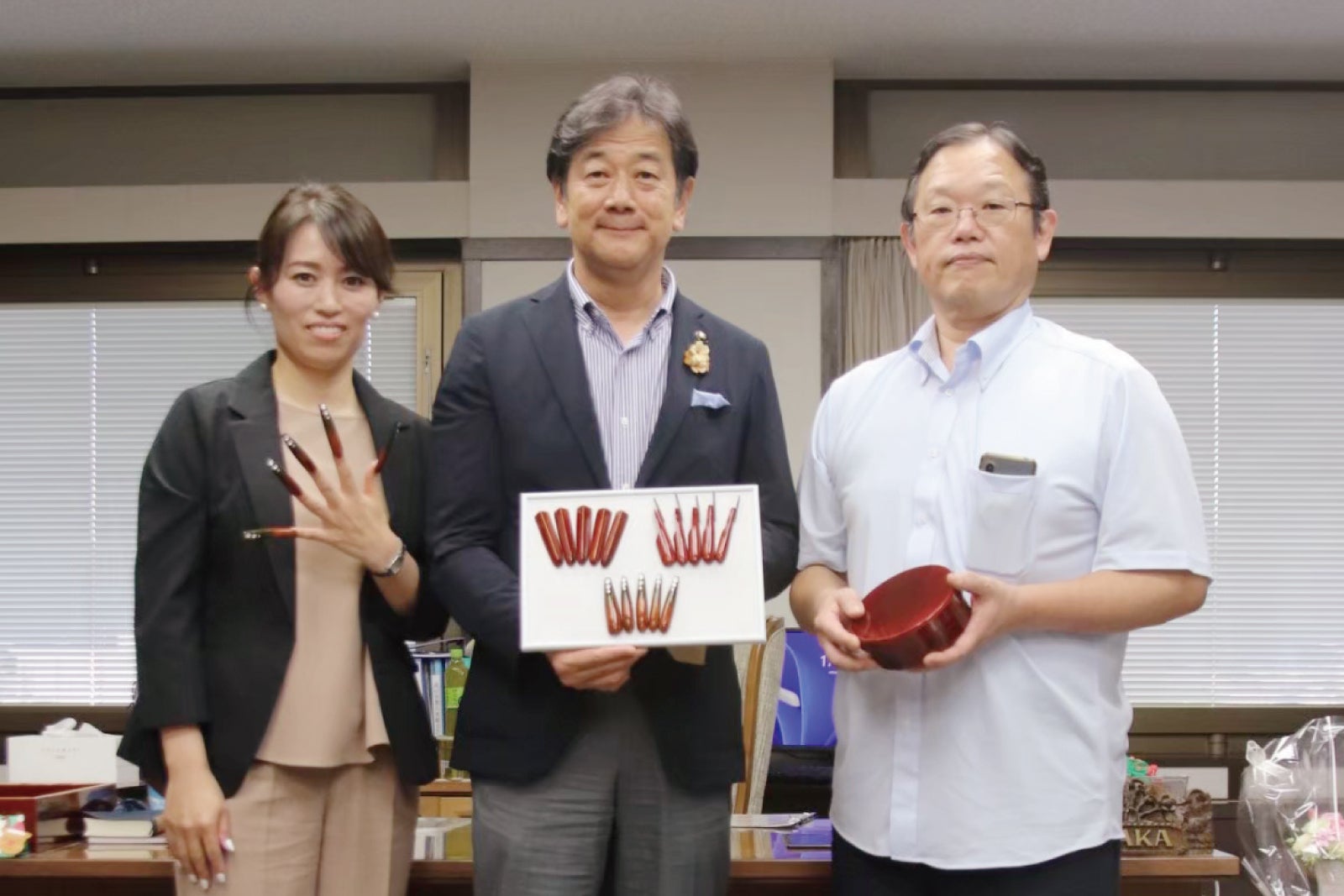 (左)ネイリスト 佐藤/(真ん中)田中明 高山市長/(右)飛騨春慶 塗師・伝統工芸士 川原さん
