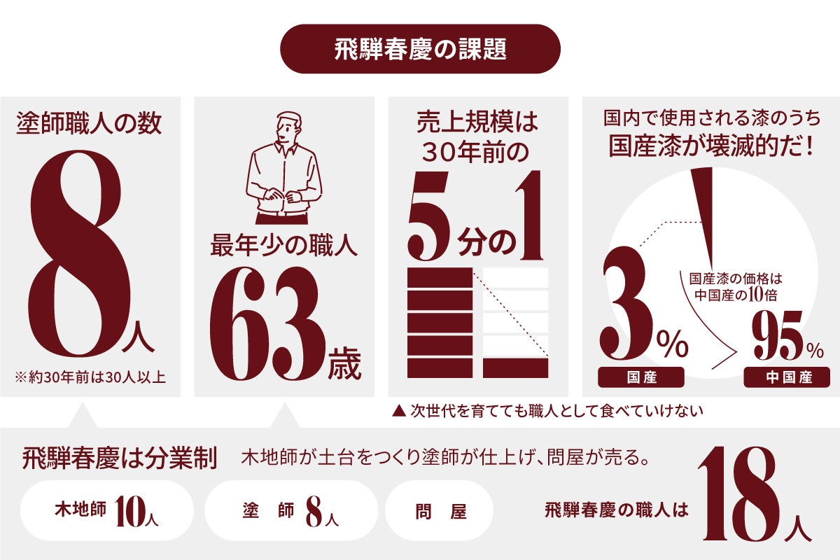私たちが今回このプロジェクトを始めた一番の理由は、存続の危機にある飛騨の伝統工芸「飛騨春慶塗」を次世代に繋いでいくためです。400年続く地元を代表する伝統工芸のひとつが、後継者不足により途絶えてしまうのは時間の問題になっています。