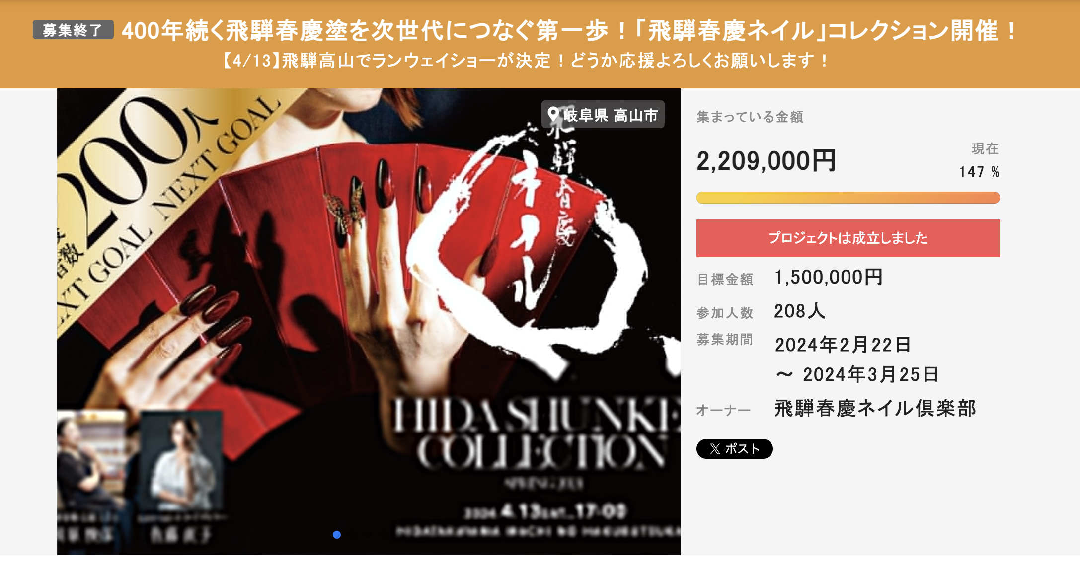 クラウドファンディング 第一弾成功!4/13に高山でコレクション開催決定!