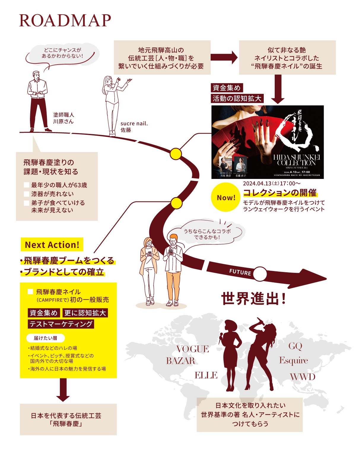 飛騨から世界に私たちの活動を発信するため、まずは地元で応援いただく活動にするために「飛騨春慶ネイルコレクション*」を地元開催することを最初のゴールに掲げました。