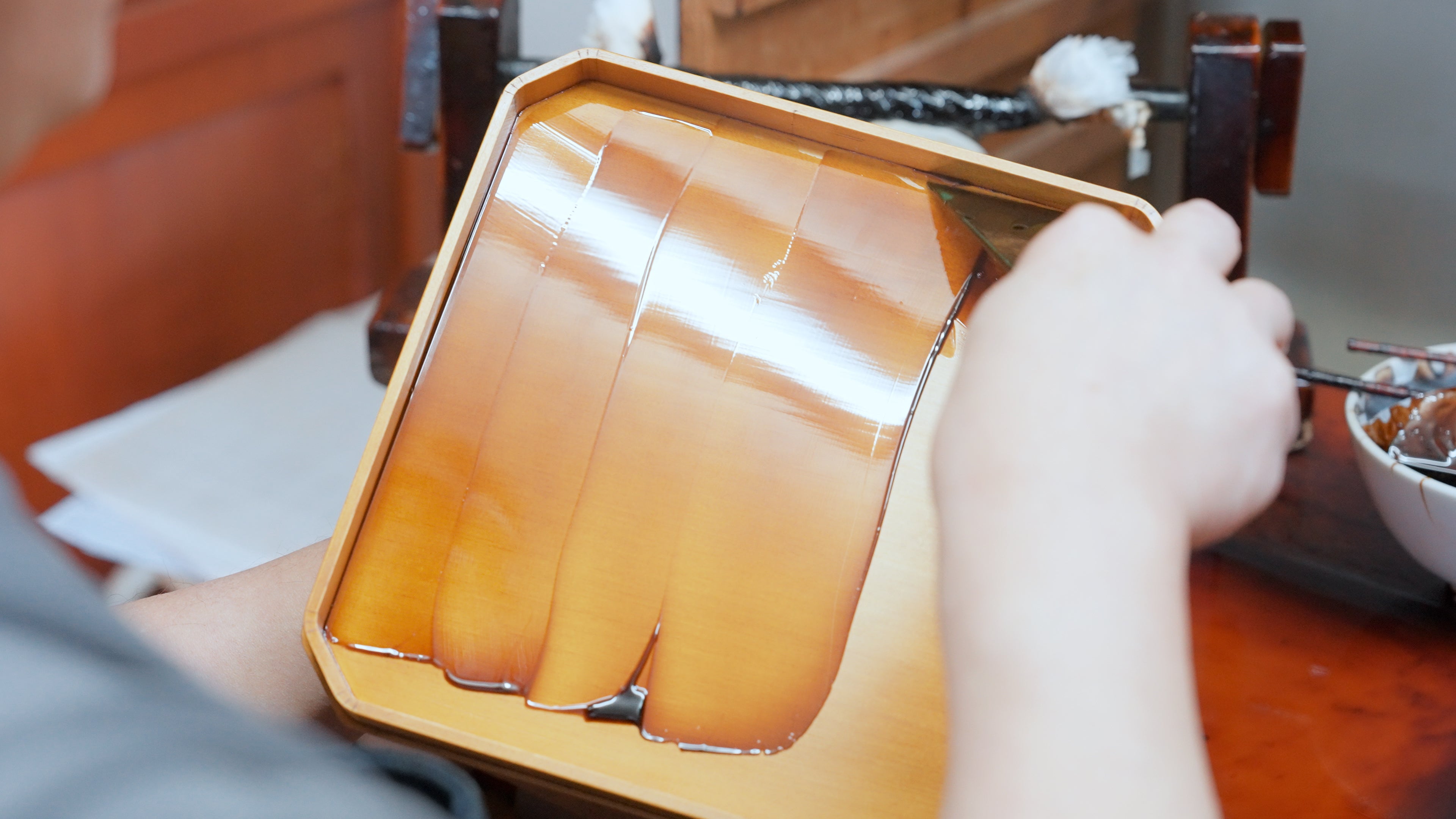 漆塗りは、黒漆・朱漆が基調とされる中、春慶塗は透漆(すきうるし)で仕上げ