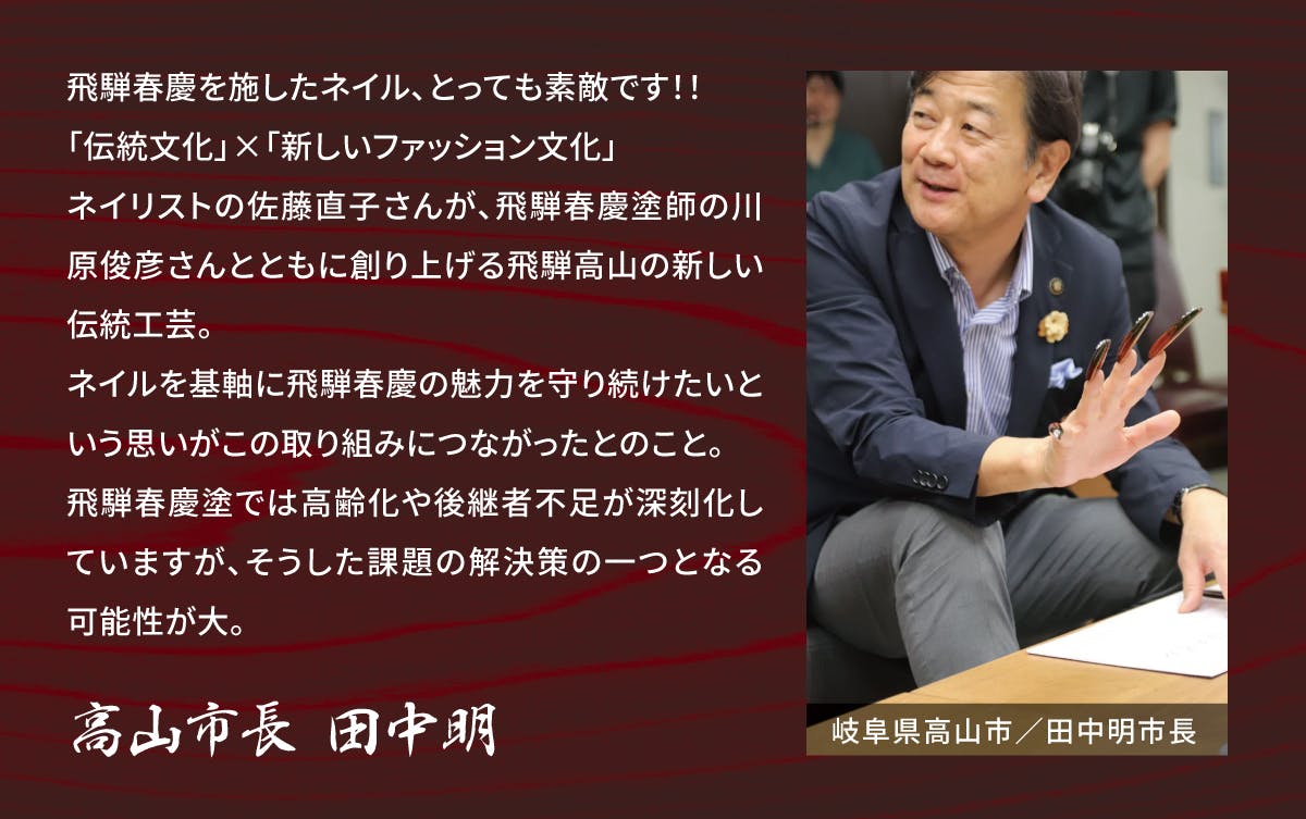 その一歩をネイルという新しいカタチで踏み出し、飛騨春慶の価値を世界まで届けようとしています。