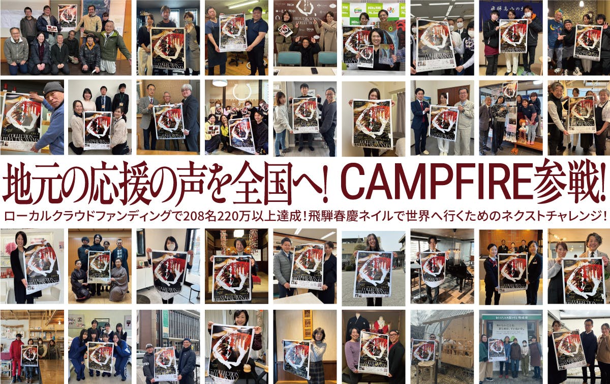 OCOSでのクラウドファンディングを第一弾としたのは、まずは地元飛騨地域の人から応援していただける活動にしたいという想いと、「飛騨春慶ネイルコレクション」開催のための資金集めを目的とした為でした。