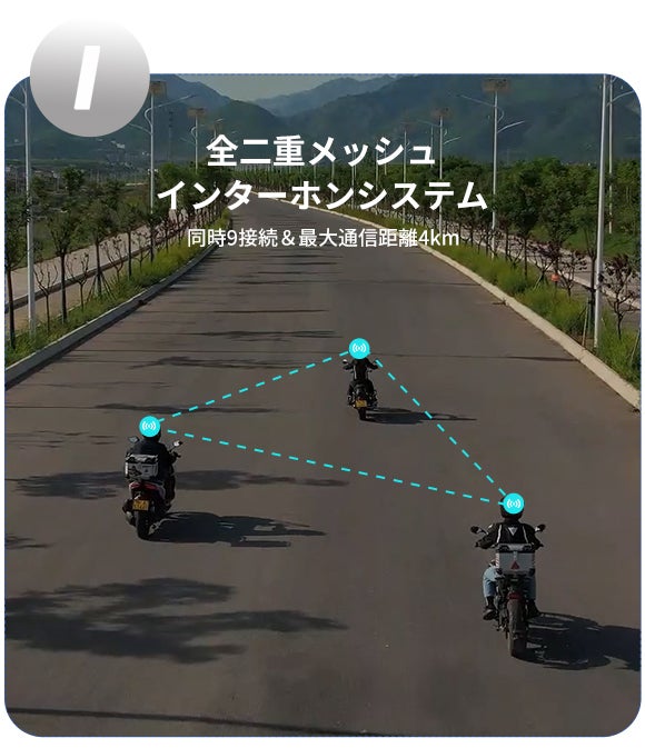 友人とのツーリング時には、メッシュ通信により常に繋がりが保たれ、美しい景色、現在地、方向転換、危険、停止などの重要な情報を共有できます。安全性を高め、ツーリング中のさらなるサポートを提供します。