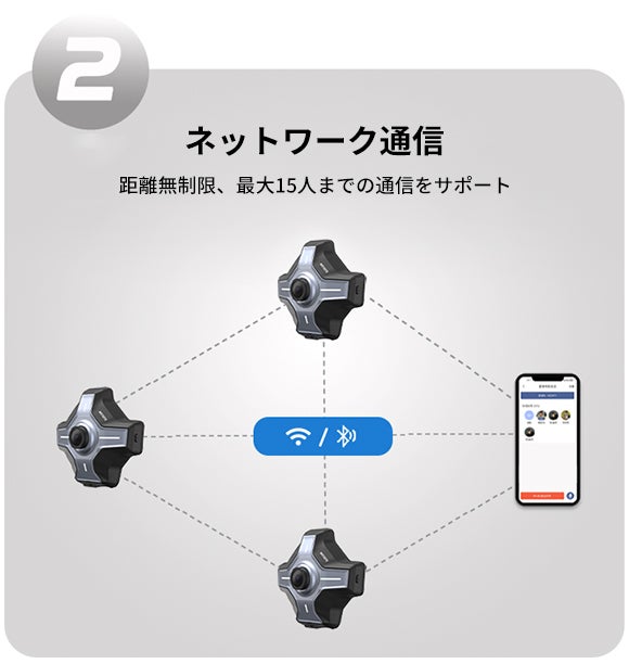 「MOTOEYE E6&E6 SE」はメッシュ通信機能を備えており、ネットワークトポロジを動的に調整できます。インターカム処理中は、任意の2つのノード間の距離が通信範囲内であれば通信を行うことができます。メンバーの一人が離れ通信が終了した場合でも、他のチームメンバーは通常どおり通信でき、離れていたメンバーが復帰すると自動的にチームに再参加できます。