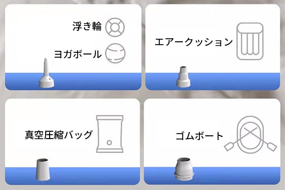 また、空気入れ/抜き用の4種類のノズルが付属されており、浮き輪/ボール/エアーベッド/エアープールなどの空気入れや、衣服や布団の収納/食べ物の真空パックなど様々なシーンで使用できます。