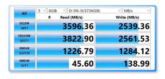 Thunderbolt 4インターフェイスを搭載したノートPC上のSamsung 980 Pro-1TBでテストしたところ、3500MB/sの読み込み速度、2500MB/sの書き込み速度を実現しました。