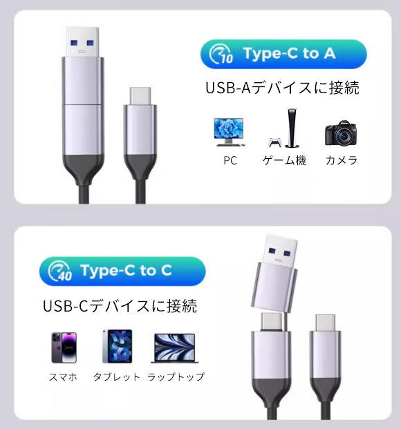 USB-C to USB-A&USB-Cの2 in 1ケーブルを備えており、複数のケーブルを準備する手間はありません。