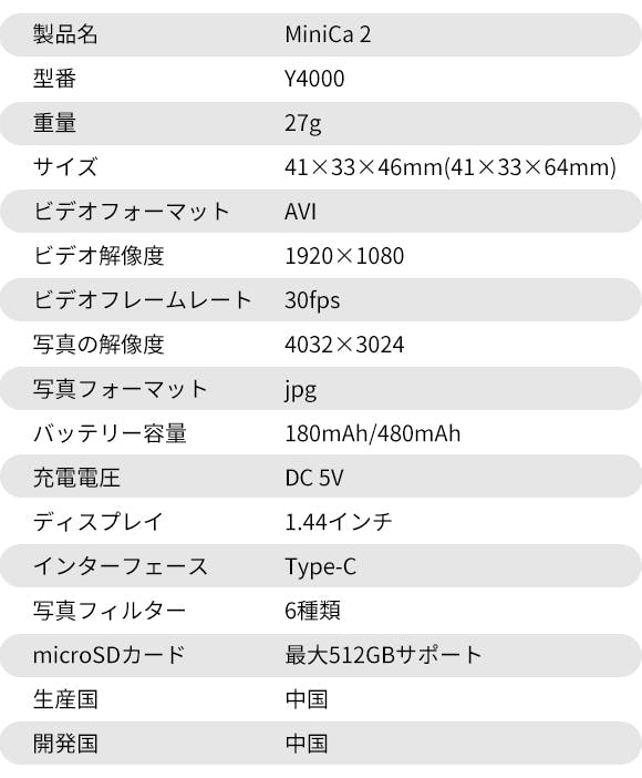「MiniCa 2」(ミニカ2)主な特徴: