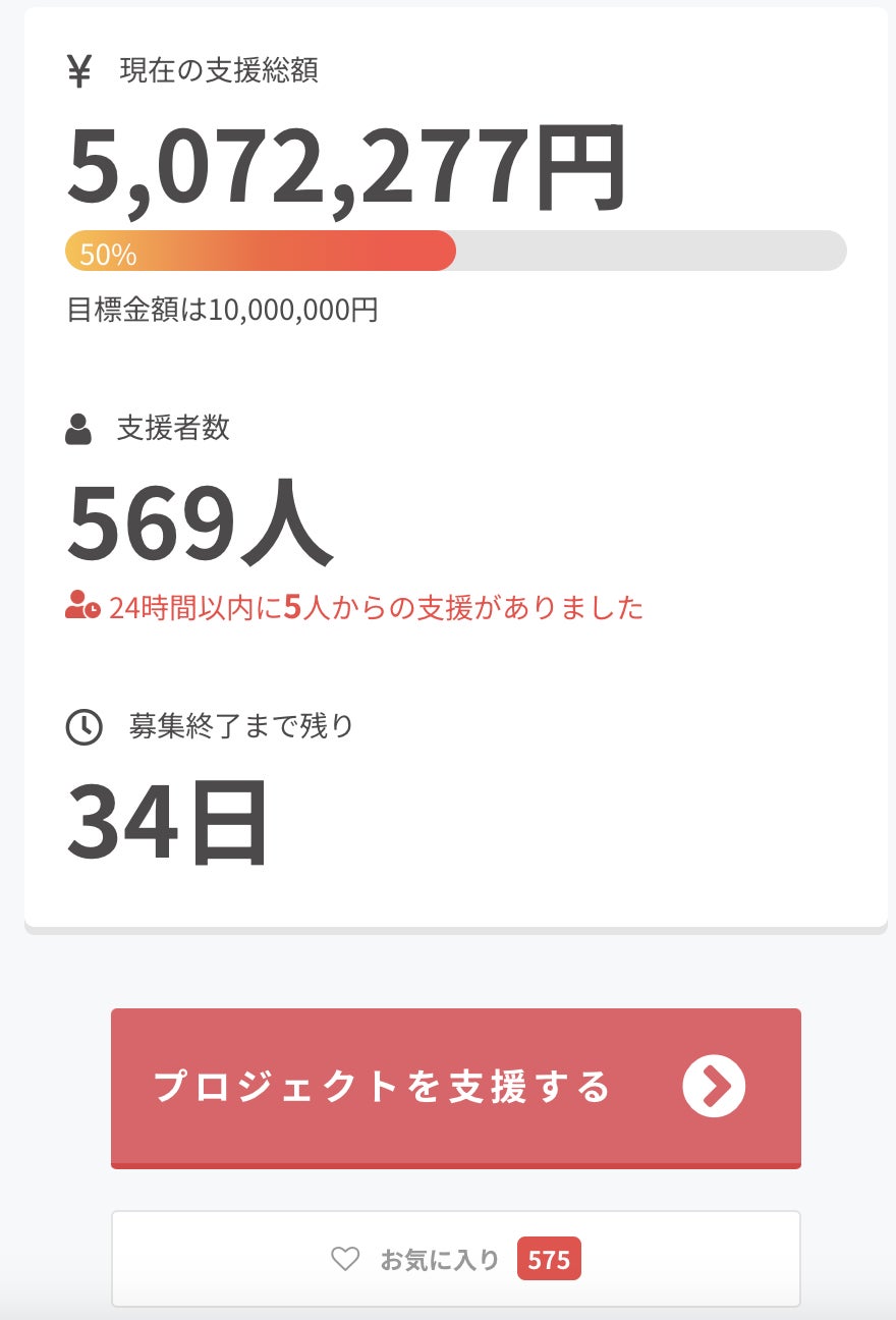 皆さまのお陰で、目標金額の50%を達成まで来ることができました。