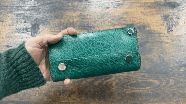 水性ラッカーで表面を軽く染色・・・これにより革に傷がつきにくく水やシミ汚れに強くなります。(ポケットに入れたりガンガン出し入れするトラッカーウォレットには最適です。)