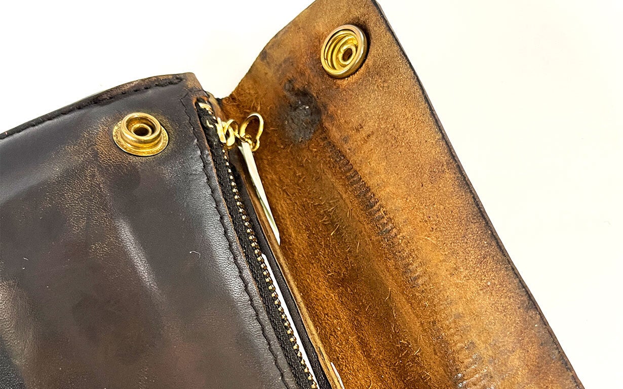 長財布などにはよくファスナーが使用されていますが、このファスナー実は破損の修理依頼が多いんです。革は丈夫ですが、ファスナーに使われている素材はポリエステルやコットンなどの繊維です。革よりも先に劣化するのは必然ですよね。中身をパンパンに入れてダメになるファスナーをよく見てきました。