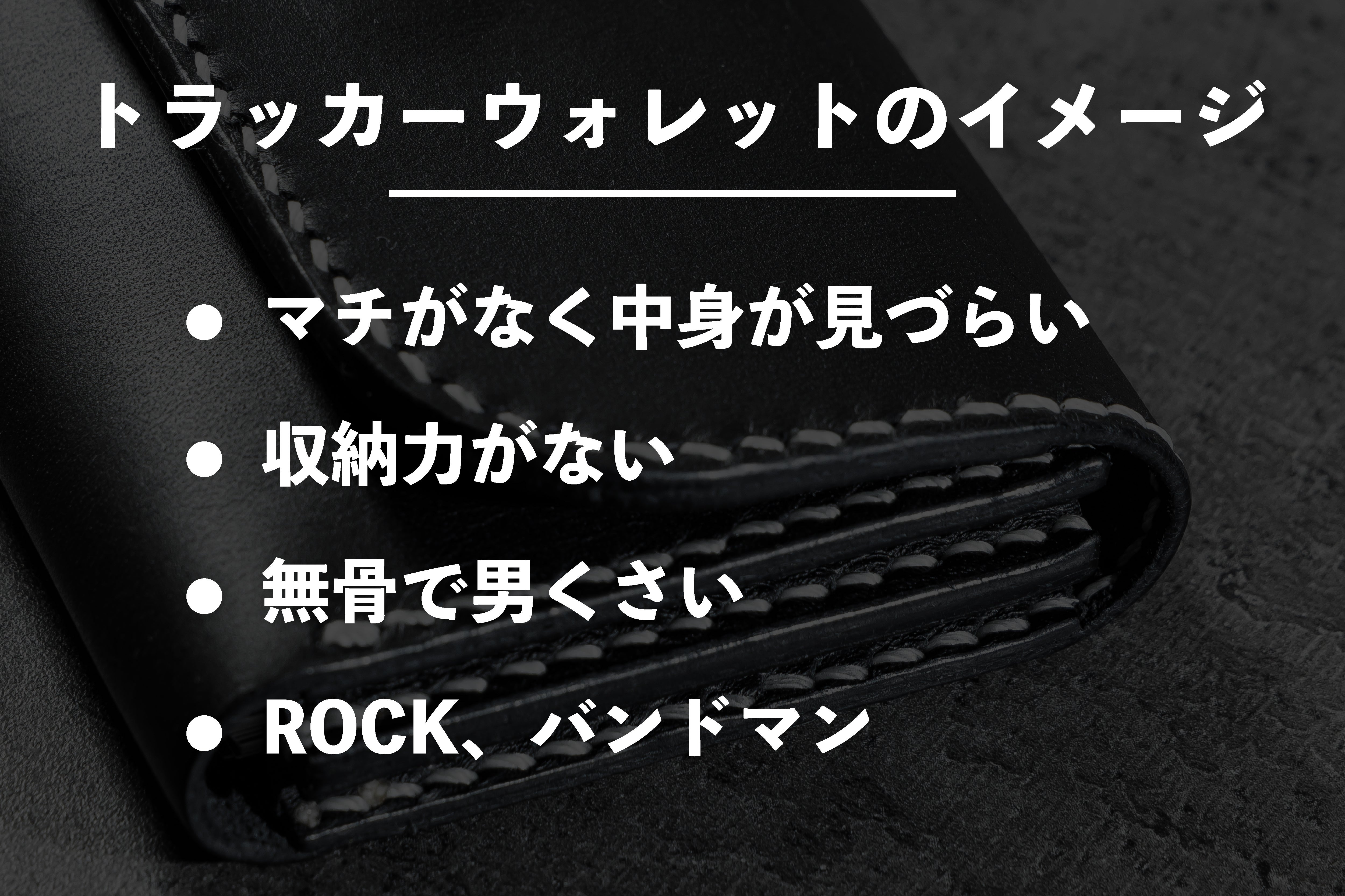 トラッカーウォレットとは、アメリカのトラック運転手がよく使っていた財布のこと。お札、配達伝票などのチケット、コイン、カードが数枚入る程度の簡素化された作りになっています。さらに集金などで頻繁に使用するため、厚めの革で丈夫に作られているのも特徴です。また、車の乗り降りやバックポケットに入れることが多いため、紛失、落下防止の役割としてウォレットチェーンが使われるようになったのもこのトラッカーウォレットが始まりと言われています。