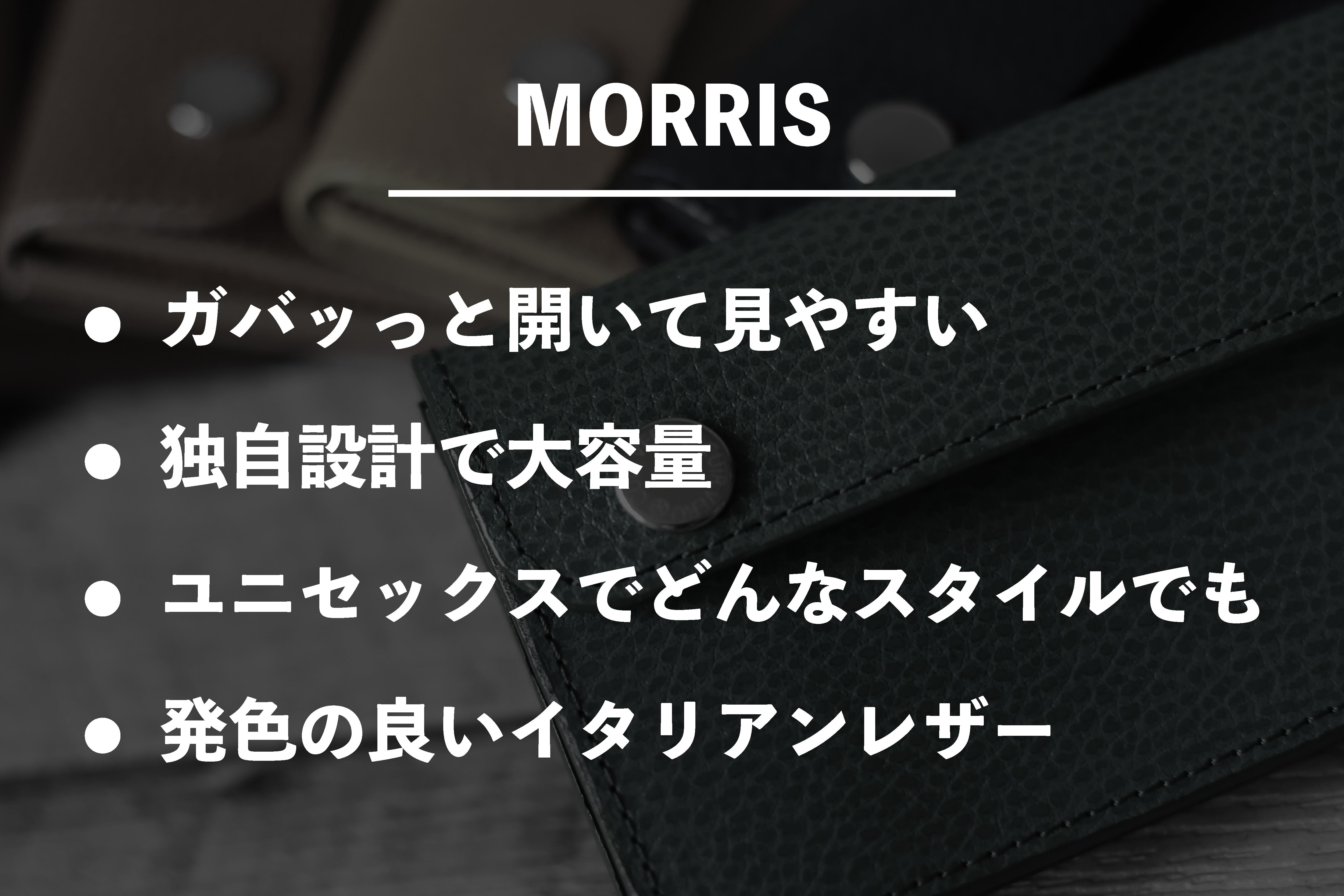 「MORRIS」のサイズはW175㎜×H88㎜とコンパクト長財布のサイズ感を踏襲