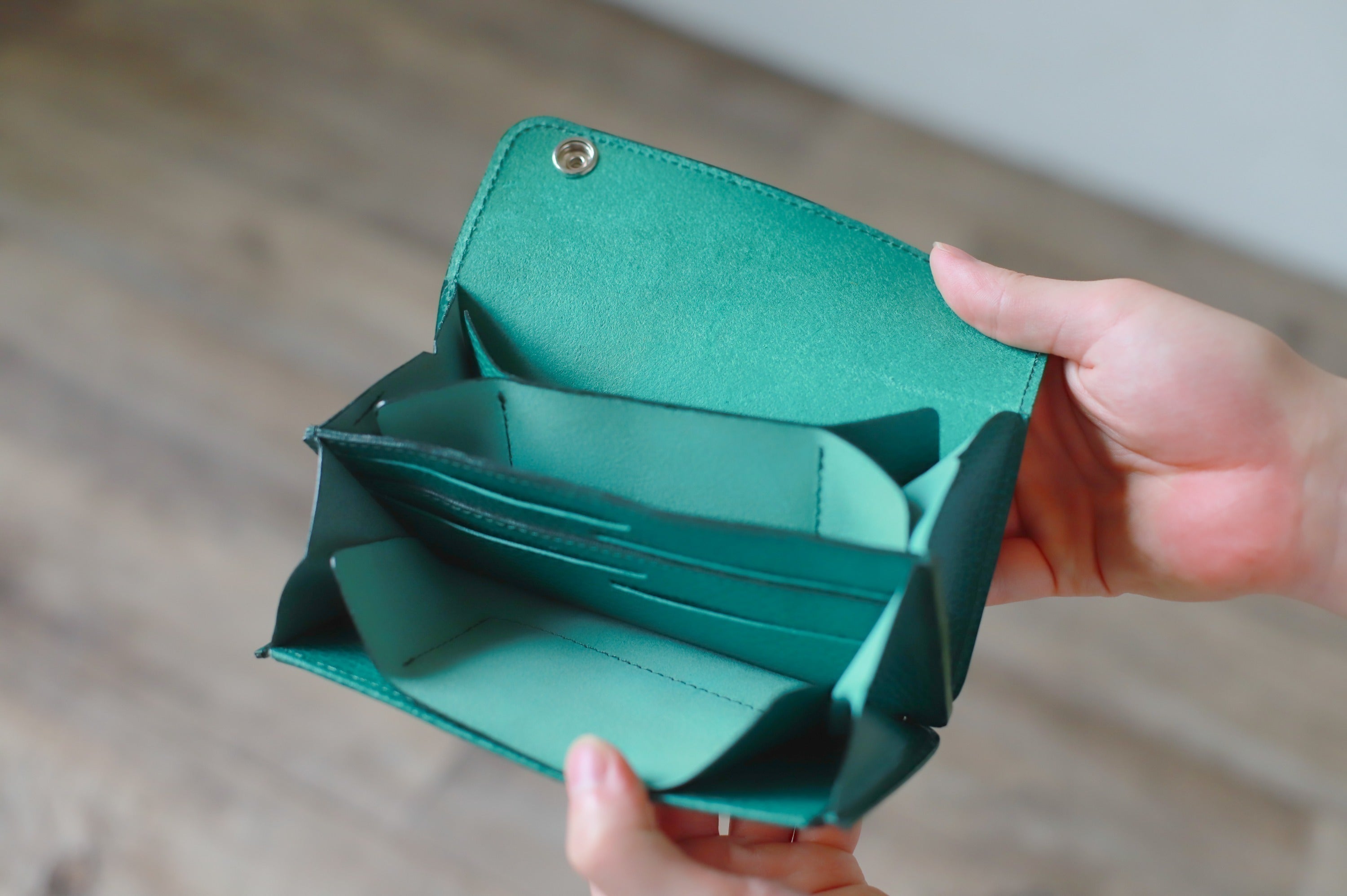 通常の長財布は1つの袋状にマチと仕切りが入り各スペースに分かれていますが「MORRIS」は別々の袋それぞれをマチでつなぎ合わせて作られているイメージです。