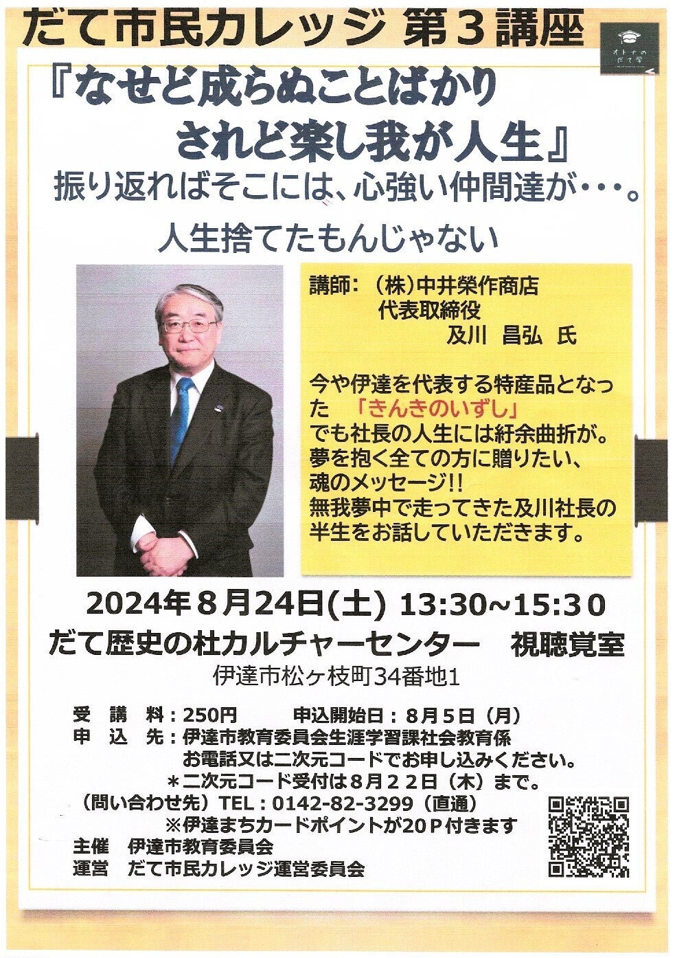 さて、話は変わりますが、今回の出版を受けて、私の地元伊達市の教育委員会さんからお声がかかり、是非市民向けの講座で講演して下さいとのことになり、いよいよ来週土曜日、8月24日午後1時半から伊達市内カルチャーセンターにおきまして開催される「市民カレッジ第3講座」でお話させて頂くことになりました。