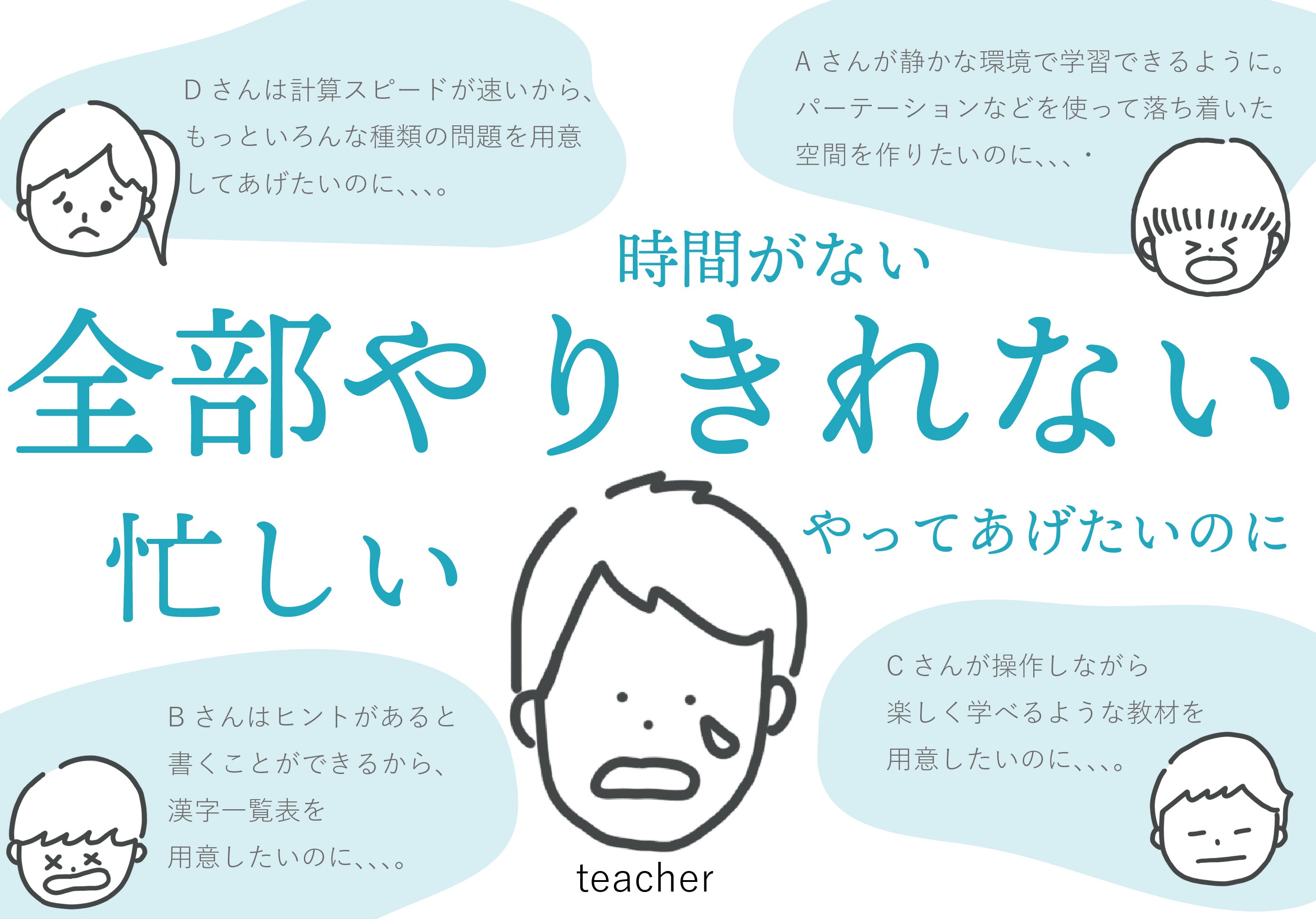 先生方は、日々研究して、授業をよりよい学ぶ時間にしようと奮闘しています。しかし、厳しい現実もあります。実態の違う子ども達を身一つで指導・支援しなければならない制度や学級編成。空き時間がなく、授業準備をすることができない毎日。教材研究をしたくても、WEBの情報だけでは、素材の質感などがわからない。「研修を受けたい、専門性を向上させたい」という先生たちの強い願いは、儚く散っています。そして、時間や業務に追われてしまう学校で過ごす中で、必死に働きながら、疲労感や困り感を抱えている先生は、決して少なくありません。