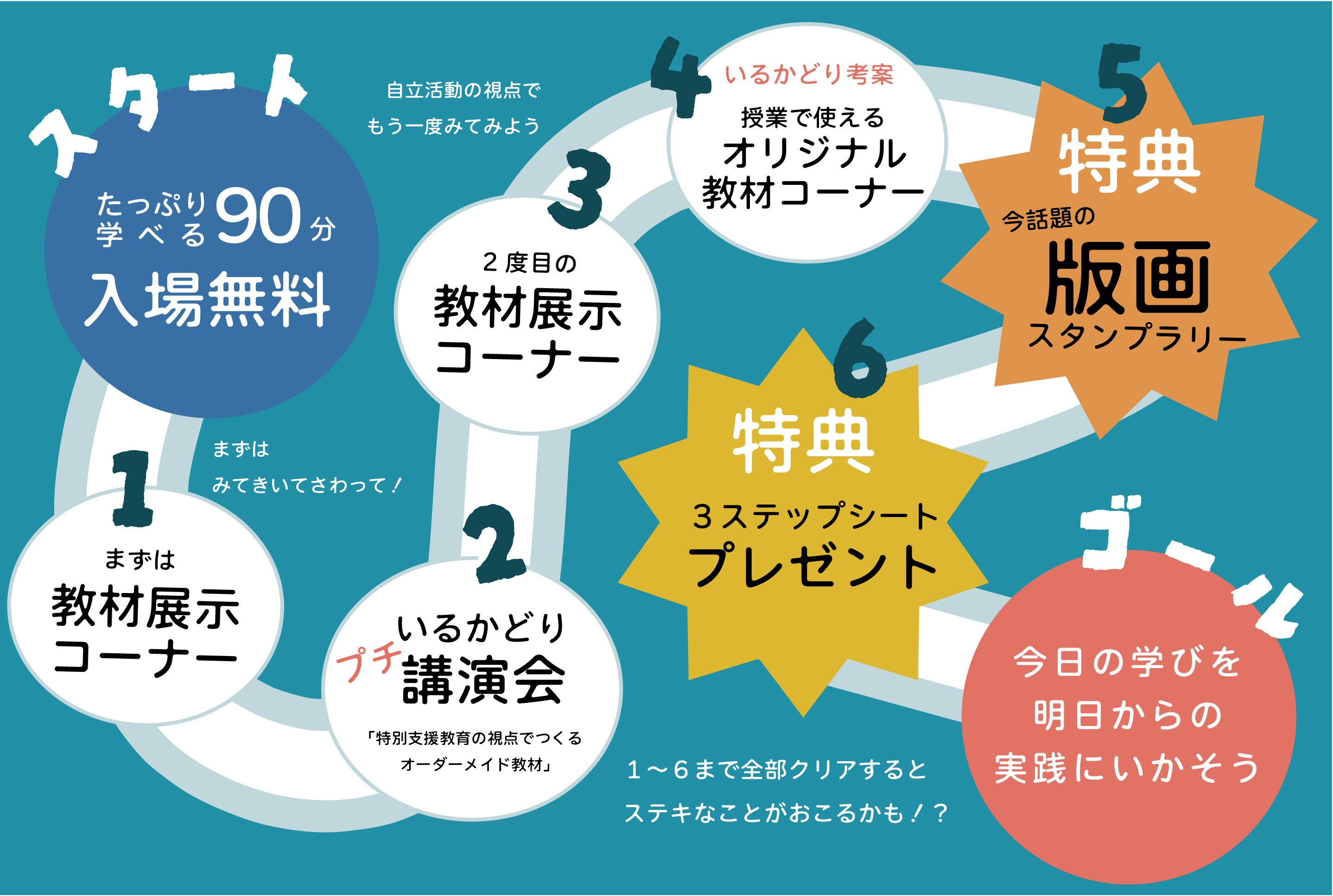 来場者の皆様の「もっとゆっくり教材を観たい!」という声を大切にできるように、今年はたっぷり90分間学ぶことができます。自立活動の授業づくりで活用できる3ステップシートや版画スタンプなど、お楽しみも用意しております。