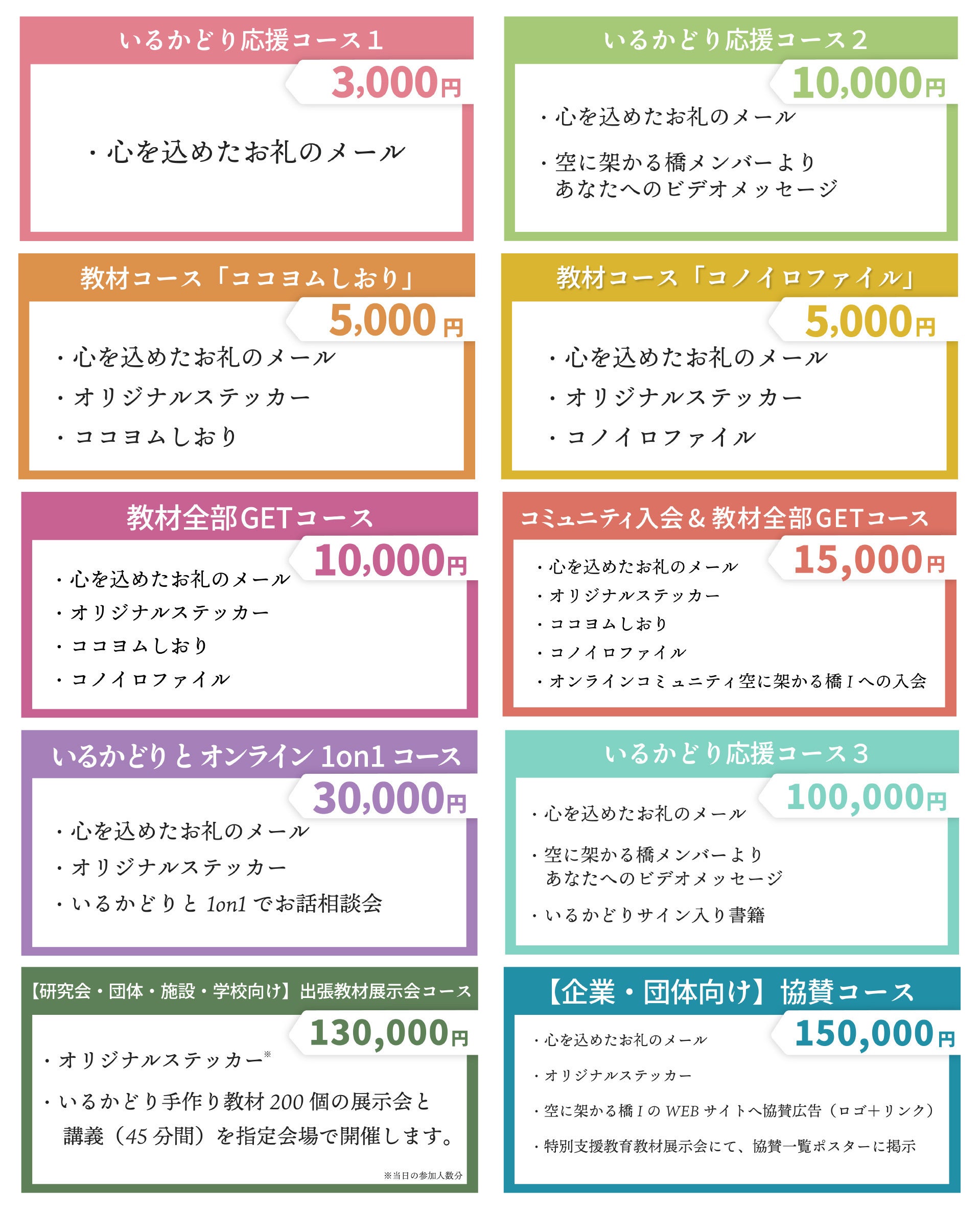 2024/07/16 20:44お世話になっております。いるかどりです。特別支援教育教材展示会4 in 横浜&大阪 開催に向けてのクラウドファンディングでは、多くの皆様に支えられて、無事に目標に達することができました。これも、ご支援をしていただいた皆様のおかげです。誠にありがとうございます。2024年7月16日火曜日現在、横浜と大阪の会場を合わせて300名以上の皆様が来場予約をしてくださっています。子ども達のために学びたいと願い来場される皆様と共に学び合えることができること、本当に幸せに思います。これも、ご支援をいただいた皆様のおかげです。ありがとうございます。10万円あったら何ができるだろう。神奈川県のすべての公立小学校と特別支援学校に招待状を送ることができる。20万円あったら何ができるだろう。神奈川県と大阪府のすべての公立小学校と特別支援学校に招待状を送ることができる。30万円あったら何ができるだろう。招待状の配布と横浜会場を予約することができる。40万円あったら何ができるだろう。招待状の配布と横浜会場と大阪会場を予約することができる。50万円あったら何ができるだろう。横浜会場と大阪会場に教材を郵送することができる。そして、今回、クラウドファンディングと同時に、Instagramにて受付していたいるかどり教材の申込者で希望する方は教材展示会に向けた寄付をすることができるシステムをとっていました。クラウドファンディングとInstagramの2つを合わせてなんと50万円もの支援金をいただくことができました。本当に本当にありがとうございます。皆様の想いが集まり、特別支援教育教材展示会を無事に開催することができます。心から感謝を申し上げます。ありがとうございます。当日は、200点以上の手作り教材の展示、100点以上のプリント教材の展示が予定されています。昨年度からさらにパワーアップしたいるかどり教材の展示会に向けて、日々、着実に取り組んでいますので、ご期待ください。本日の活動報告は、ココヨムしおり、コノイロファイル、教材全部、のリターンを選んで支援していただいた皆様へ発送が完了したことをお伝えいたします。郵便局から普通郵便にて発送しておりますので、3日間〜7日間程度で届くことが予想されます。また、全国に50枚しかないオリジナルステッカーを同封しておりますので、お受け取りください。今後とも、誠心誠意気持ちを込めてがんばって参ります。引き続きよろしくお願いいたします。梅雨が明け、いよいよ本格的な夏の訪れとなります。どうかご自愛くださいね。たくさんの愛を込めているかどり もっと見る