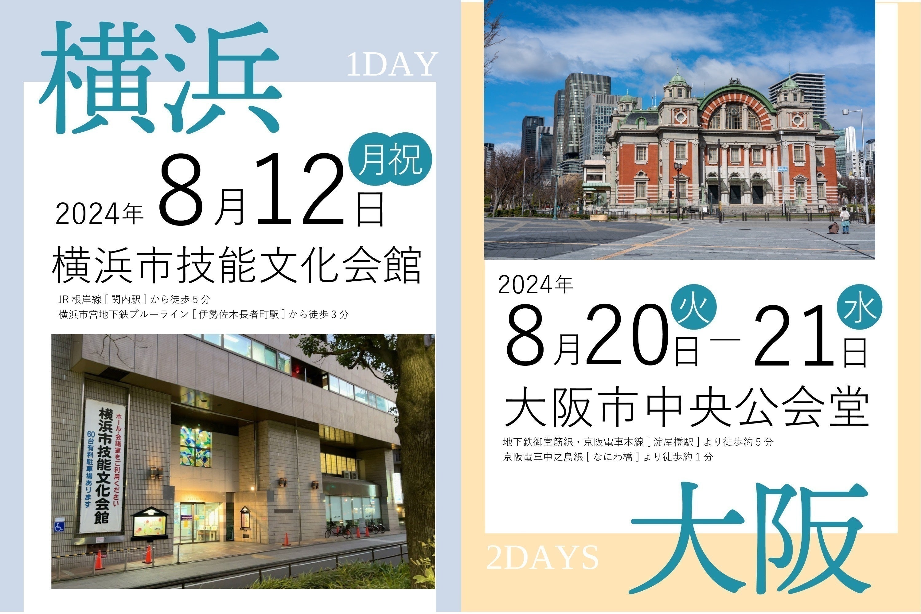 そして今年、2024年は、 大阪府「大阪市中央公会堂」神奈川県「横浜市技能文化会館」の2会場で教材展を開催し、合計800人以上の皆様の招待を目指します。