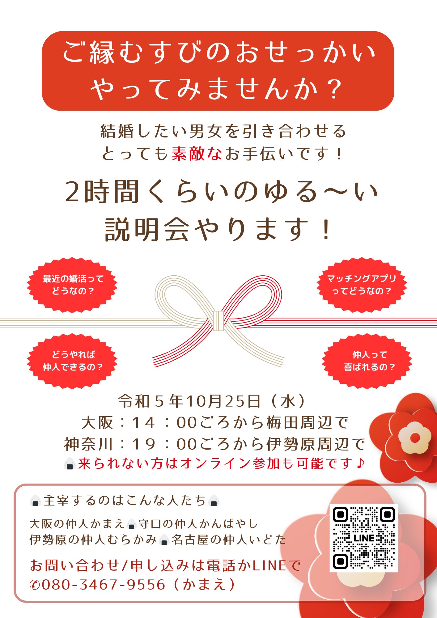 2023年10月25日には、大阪と神奈川で、ご縁むすびサロンの相談会をひらきました。当日は8名の方々に参加していただきました。(下図は募集のフライヤーです)