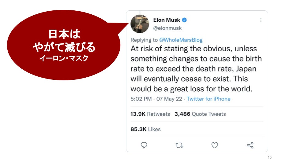 米国の電気自動車のテスラ社のCEO、宇宙ロケットを開発しているスペースX社のCEOであり、ツイッター社を買収してXと名前を変えたイーロン・マスク氏が、このままでは日本は滅びるとつぶやきました。