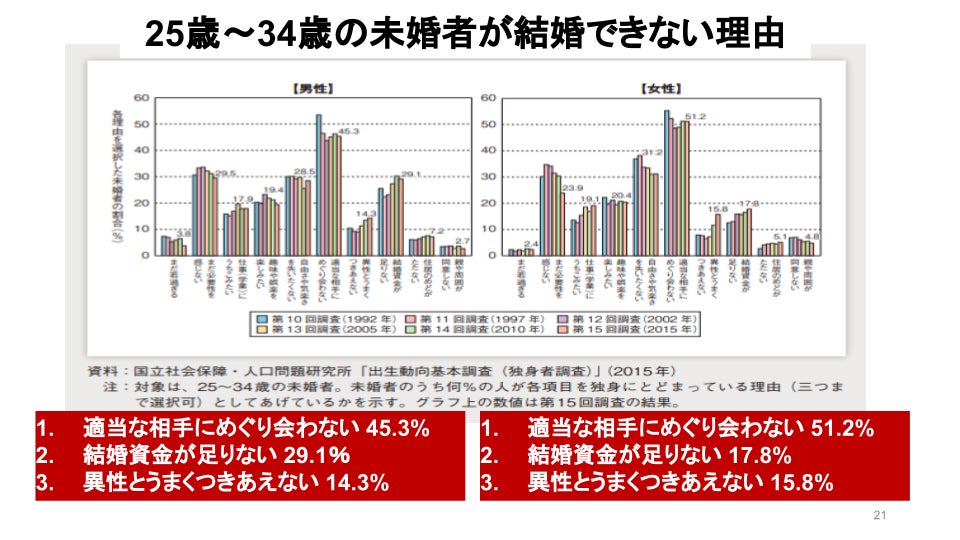 多くの独身者は、本当は結婚したいのだけれど、出会いがない、よい人がいない、結婚資金が足りない、異性とうまくつきあえない、などの理由で結婚できないのが現実です。