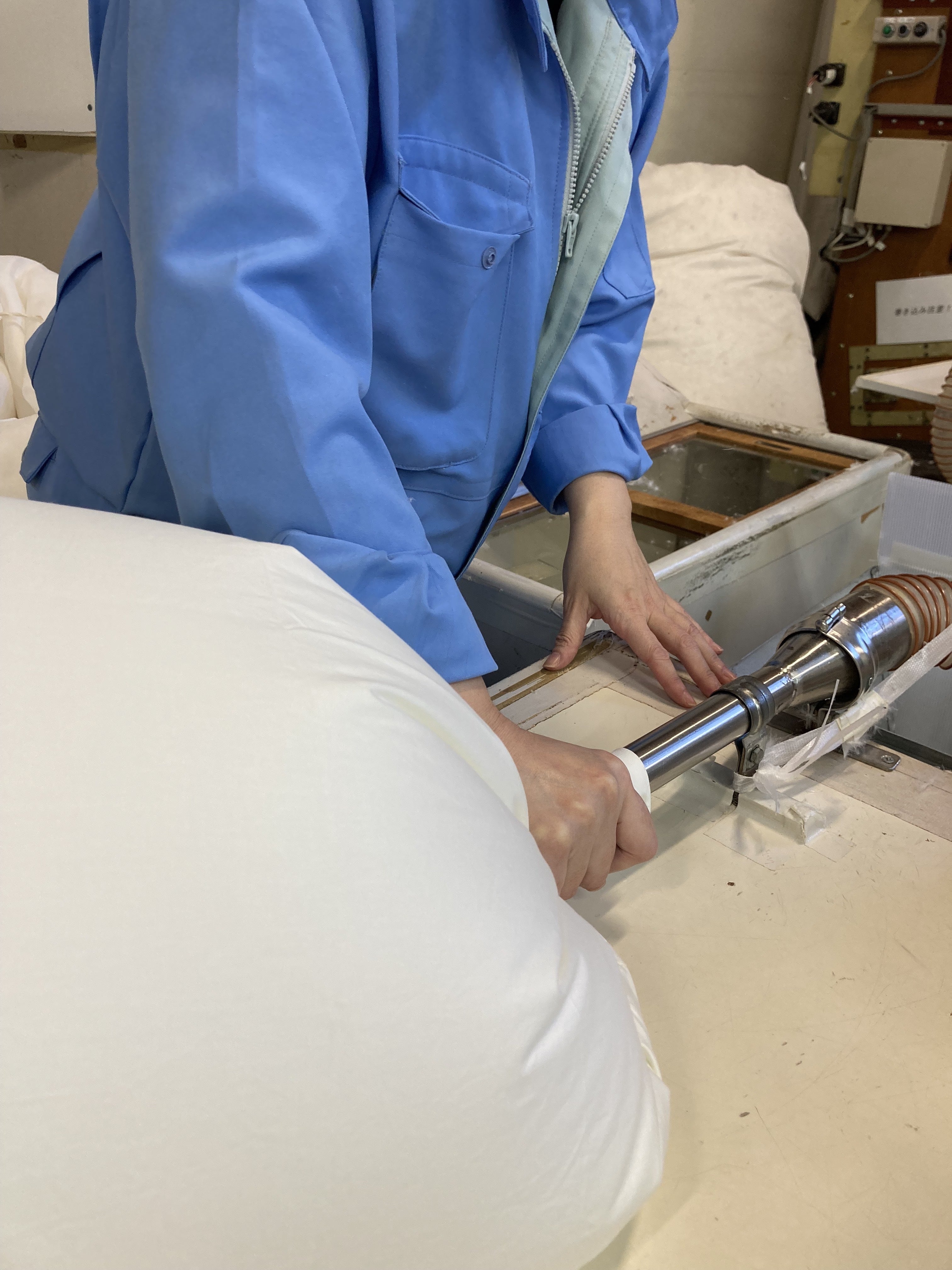 洗浄前 洗浄後普段の羽毛の吹き入れ作業の様子